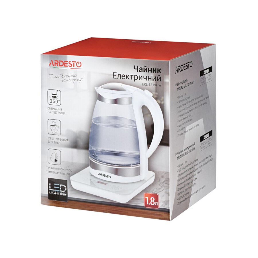 Електрочайник Ardesto EKL-1319HW - 1.8л/1800Вт/7 реж. контрол. темпер./скл. корпус/білий