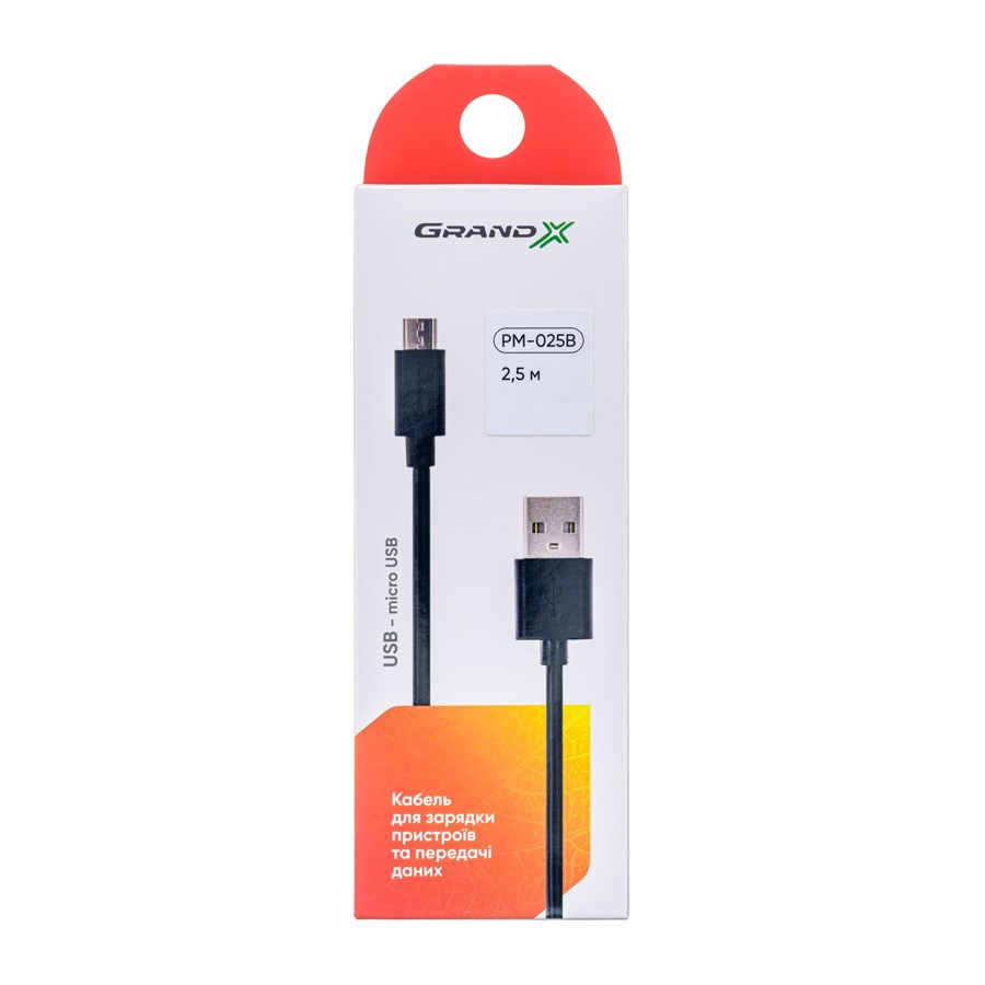 Кабель Grand-X USB-micro USB PM025B, 2.5m, 100% Cu, Black