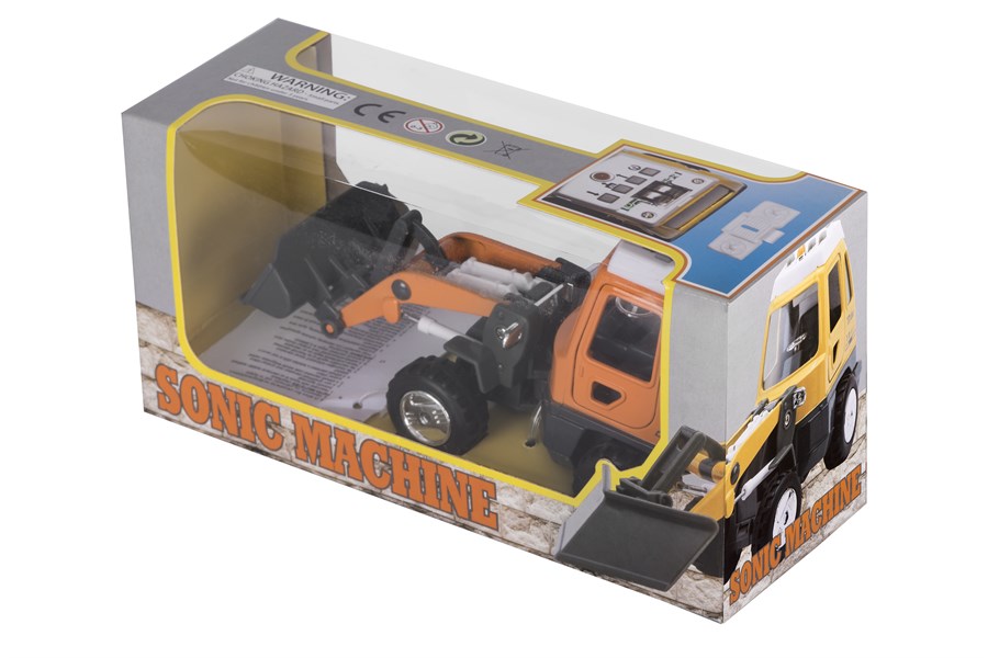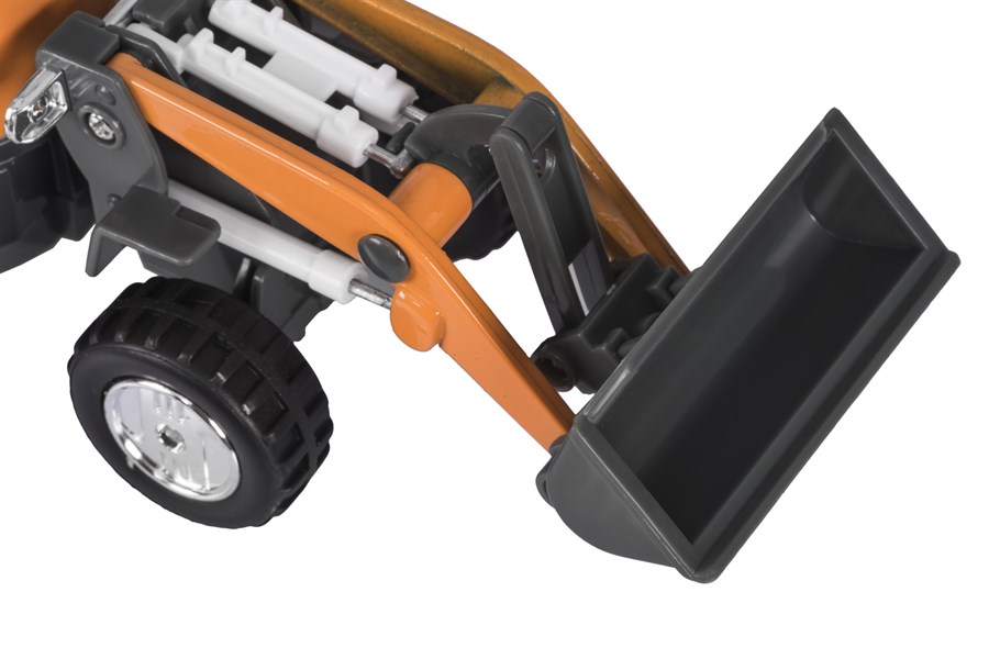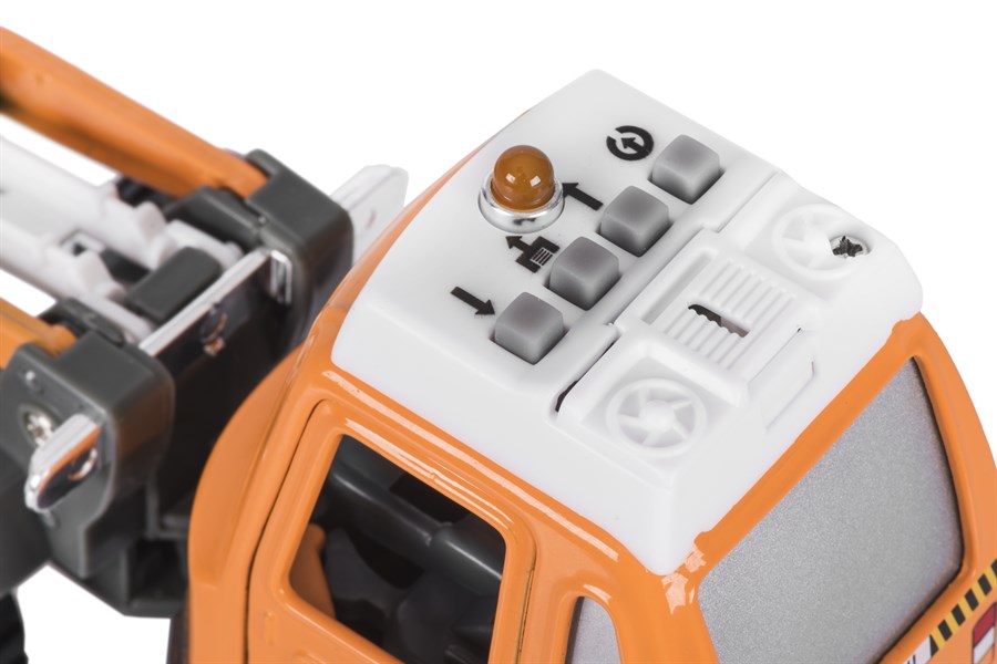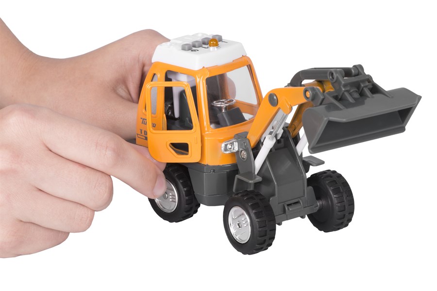 Екскаватор із серії «Спецтехніка» німецького виробника іграшок goki. Машинка металева, окремі деталі – пластикові, колеса – гумові. Розміри іграшки – 16 х 6 х 7 см. Екскаватор із інерційним механізмом інтерактивними елементами: звуковим супроводом та світловими ефектами (блимання лампочок). Машинка для дітей від трьох років.