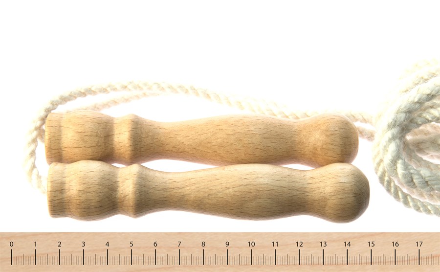 Скакалка – це традиційна іграшка для вулиці, вона принесе велике задоволення та безліч емоцій дітлахам від 5 років. Скакалка упакована у прозорий поліетиленовий пакет. Мотузка надзвичайно міцна, ручки вироблені із бука, вкритого червоною фарбою. Дерев’яні ручки дуже якісно оброблені, тому батьки можуть не переживати, що їхня дитина пораниться. Довжина скакалки фіксована – 2,5 м, але довжину можна зменшувати, намотуючи її на руку. Підходить підліткам зростом до 165 см.