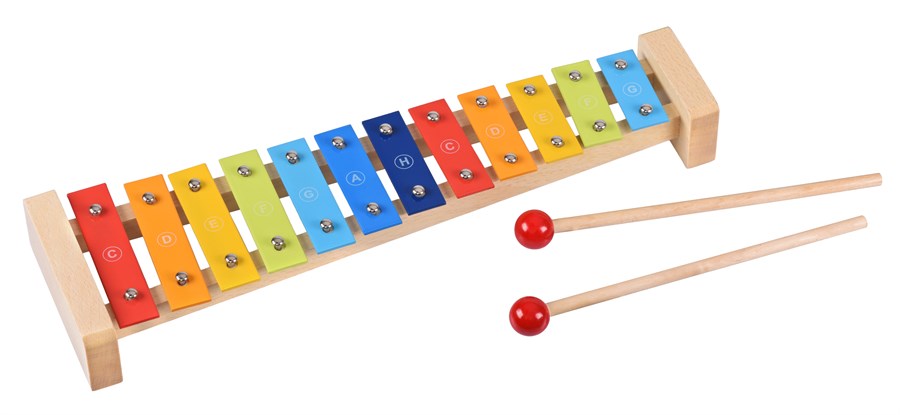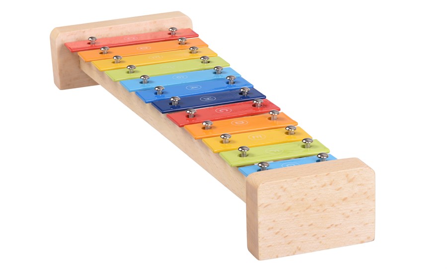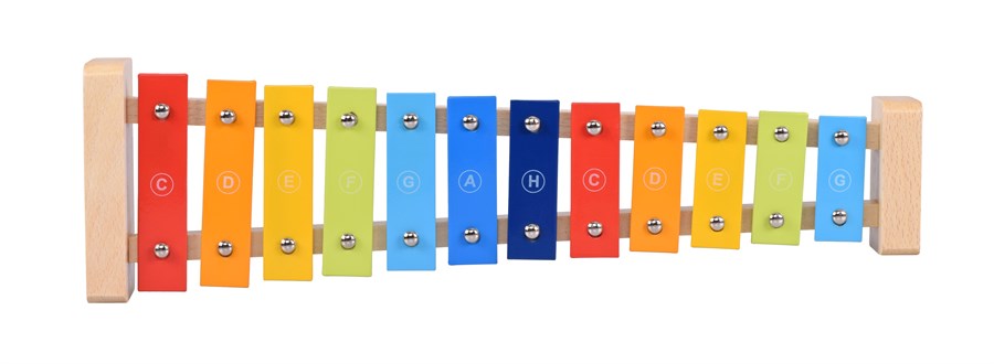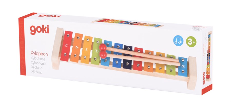 Барвистий ксилофон – музичний інструмент німецького виробника іграшок goki. Інструмент вирізняється якісним виготовленням і чудовим звучанням. Корпус ксилофона міцний і надійний, виготовлений із деревини. На корпусі 12 кольорових пластинок-клавіш. У комплекті дерев’яні палички з червоними наконечниками. Розміри інструмента – 37,5 x 10,5 x 4,5 см. Ксилофон у фірмовій картонній коробці. Інструмент для дітей від трьох років.