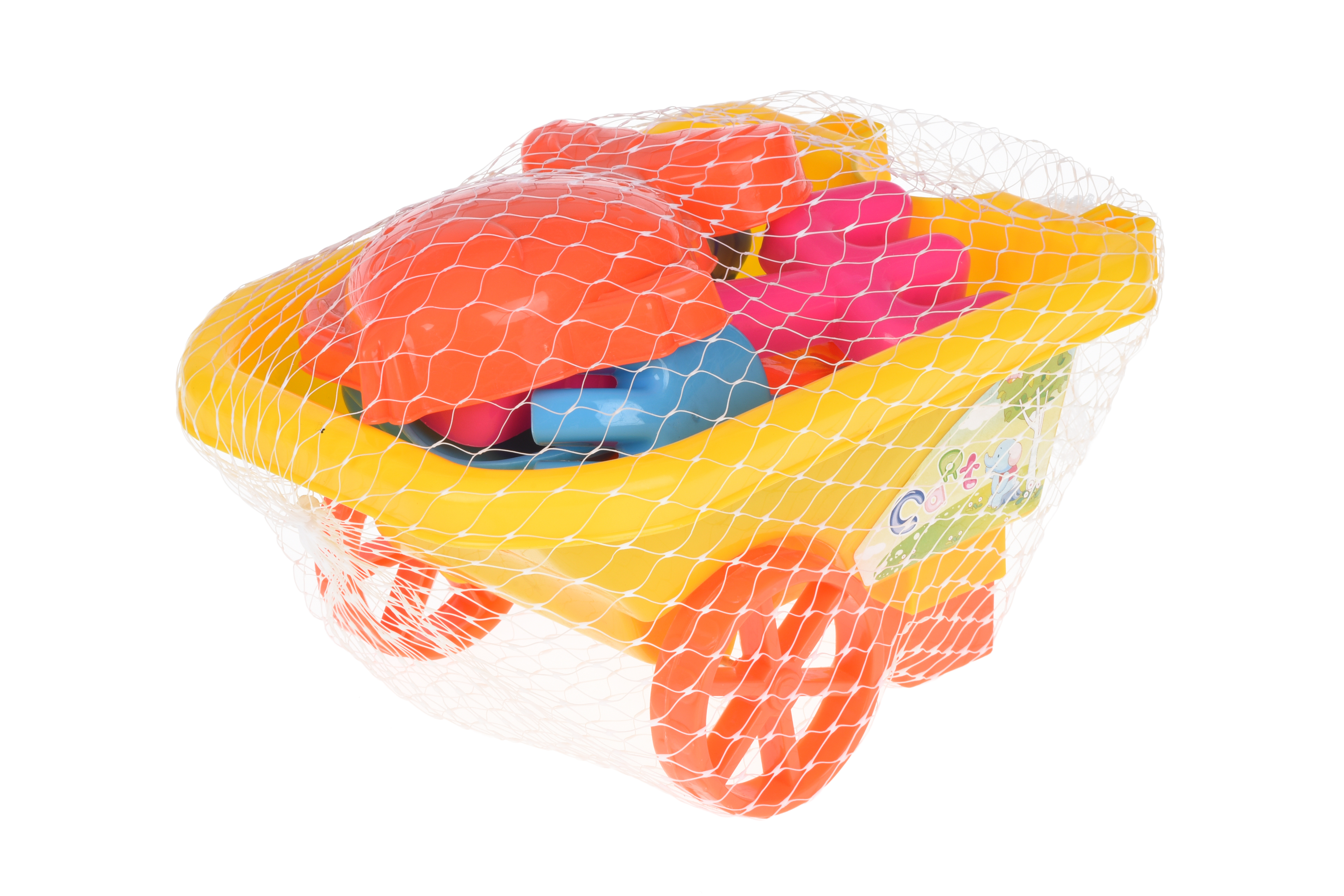 Яскравий та незвичайний набір для піску із акцентом на інструменти. У комплекті: велика тачка із знімними ручками, велика пасочка та інструменти (лопатка, сито, граблі та вилочка). Тачка жовтого кольору, її довжина (разом із ручками) 38 см, висота 12 см. У тачці можна перевозити землю або іграшки для піску. Колеса добре обертаються, вона стійка та практична. Іграшки вироблені із яскравого та міцного пластику. Для дітей від 3-х років.