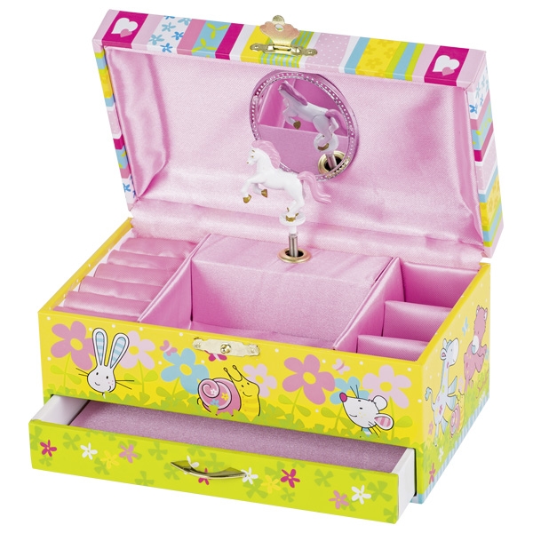 Музична скринька для прикрас – мрія кожної дівчинки. Німецький бренд goki створив скриньку із шухлядкою для зберігання коштовностей і маленьких таємниць дівчаток. Відкриваючи скриньку, дівчата побачать маленьку конячку, що обертається під приємну класичну мелодію. Скринька із колекції Susibelle дуже приваблива, гарно оздоблена ззовні та всередині. Дівчатам буде приємно ховати свої перші коштовності у чудову компактну шкатулку.