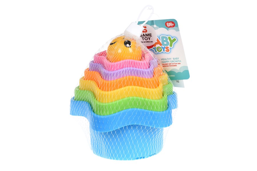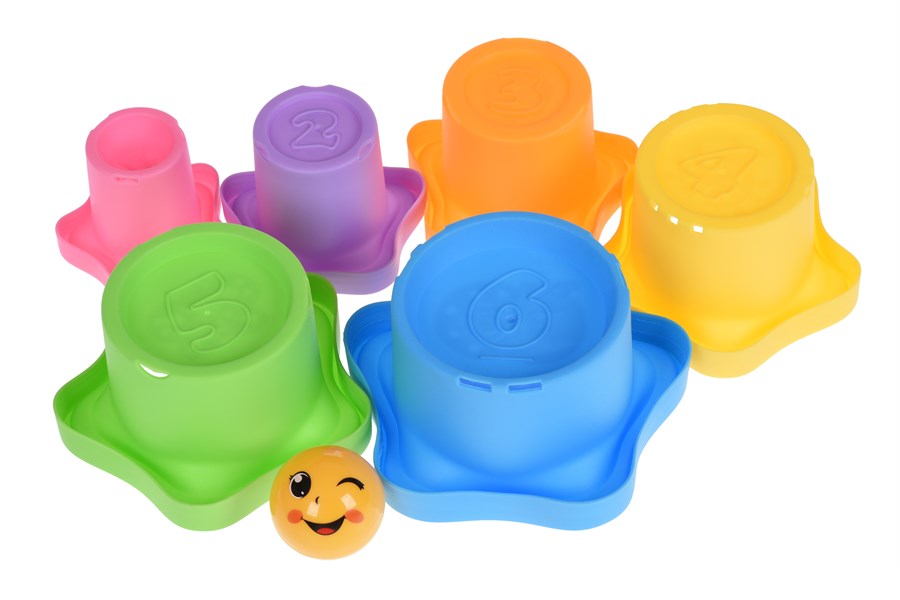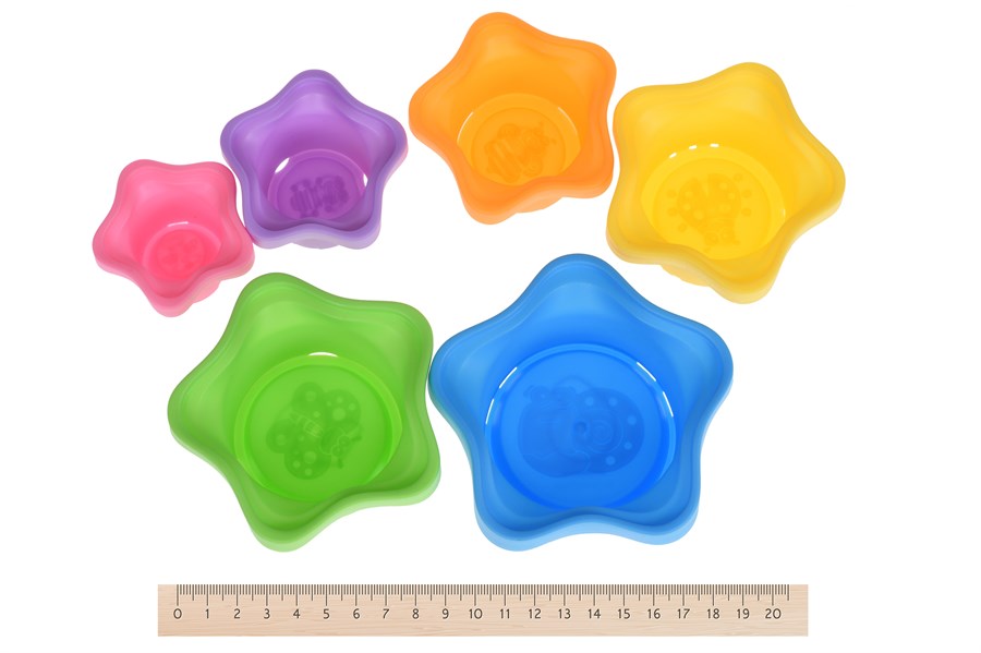 Різнобарвний набір пасочок «Зірка» із колобком-брязкальцем від Same Toy. У наборі для пісочниці є 6 пасочок у формі зірки та кулька-брязкальце. Формочки відрізняються розміром та кольором. На дні кожної вказаний порядковий номер та індивідуальний малюнок комахи (бабка, гусінь, бджілка, сонечко, метелик, равлик). Усі пасочки вироблені із міцного матового пластику. Матеріали безпечні, нетоксичні та гіпоалергенні. Для дітей від 6 місяців.