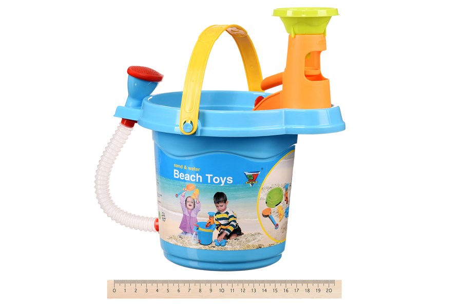 Великий набір для ігор з піском від виробника Same Toy. У комплекті велике блакитне відерце (висота 25 см.) та багато інших аксесуарів та інструментів. Всі вони яскраві, вироблені із якісної пластмаси, окремі елементи – матові. Відерце має цікаву конструкцію – до нього прикріплений невеличкий шланг із душовою лійкою. У своєрідній «величезній лійці» води вистачить на всіх друзів! Дітлахам не потрібно буде підіймати велике відро або часто бігати по воду. Також на відерце можна закріпити елемент із воронкою та млином, через який наливатиметься вода або насипатиметься пісок. У наборі також є такі необхідні лопатка, граблі, сито і 2 пасочки (морський коник та рибка). Набір розвиватиме моторику рук, фізичну активність, сприйняття кольору, форм, матеріалів. Для дітей від 3-х років.