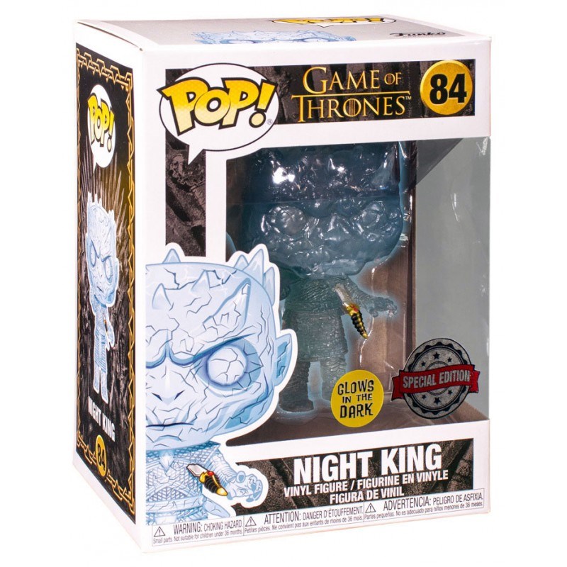 Фігурка Funko POP! Vinyl: Game of Thrones: Crystal Night King with Dagger in Chest - ексклюзивна колекційна фігура втілює головного антигероя популярного серіалу. Король Ночі (ориг. Night King) - ватажок білих ходоків. На відміну від звичайних ходоків, він носить чорний одяг, має на голові вирости, що нагадують корону, і здатний перетворювати людських немовлят в білих ходоків. Він може неймовірно швидко пожвавити величезна кількість мерців, які відразу стають поповненням його армії віхтів.