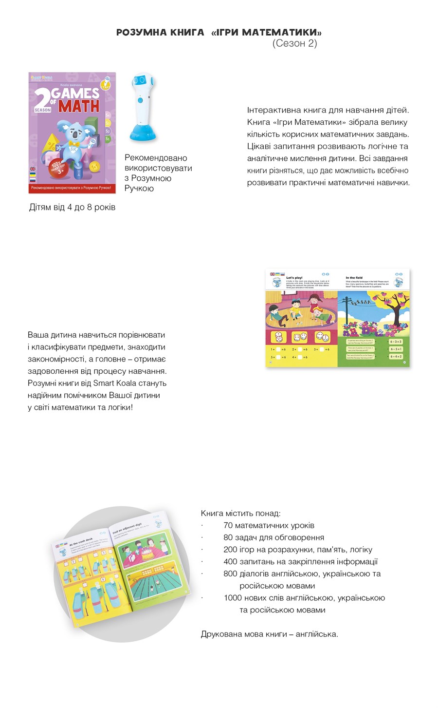 Ігри математики: сезони 1-2-3-4 складаються з 70 математичних уроків в кожній книзі; 200 ігор на обчислення, пам'ять, логіку; до 80 завдань для обговорення, аудіо супровід англійською, українською, російською мовами. Рекомендується використовувати з Розумною Ручкою.