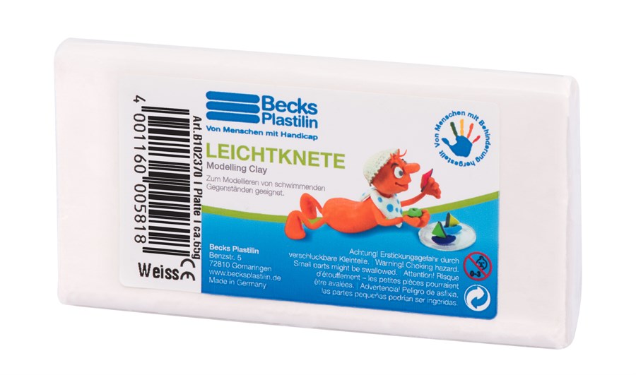 Білий пластилін серії Leightknete німецького виробника Becks Plastilin. Пластилін приємний на дотик і легко ліпиться. Пластилін напрочуд податливий, його легко розділяти і ліпити необхідні форми різних розмірів. Пластилін не висихає і протягом багатьох років гнучкий і придатний для роботи. Розмір відрізка – 12 х 6 х 1,7 см. Призначений для дітей, віком від трьох років. Пластилін виготовлений із безпечних мікрокристалічних восків, таких, що використовуються для виготовлення харчової та косметичної продукції. Не містить глютену і формальдегіду. Матеріал без запаху.
