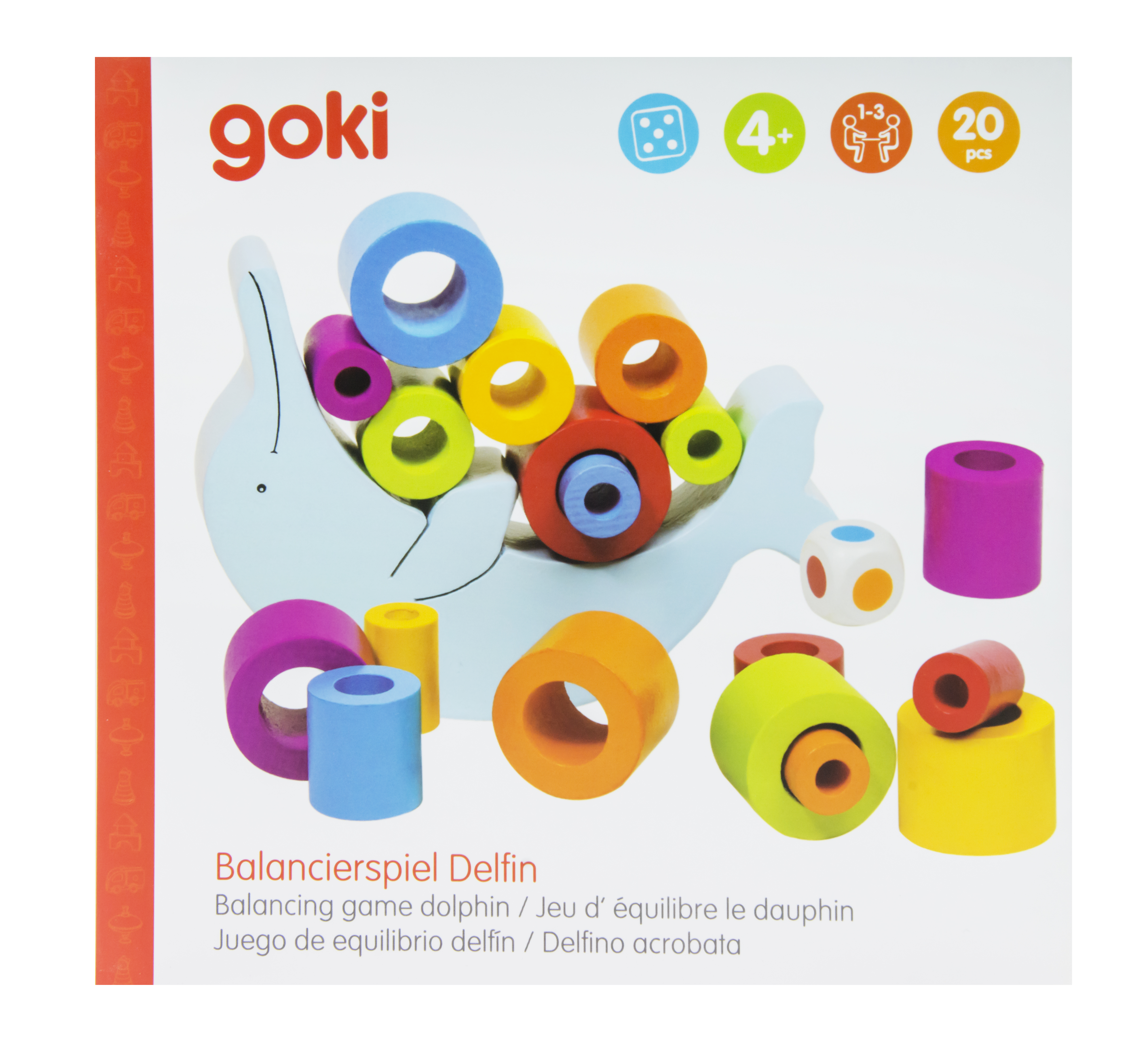 Цікава і корисна розвиваюча гра «Балансуючий дельфін» німецького виробника іграшок goki. До складу набору входить основа у формі блакитного дельфіну, а також 18 дерев’яних роликів різних кольорів та розмірів. Мета гри – розмістити яскраві ролики на дельфіні так, щоб він не впав. Гра допоможе дитині навчитись акуратності, логіки, відчуття балансу та сприйняття кольорів. Усі матеріали екологічно чисті та безпечні для дитини. Фірмова упаковка із надійного та високоякісного картону, вона практична та довго служитиме.