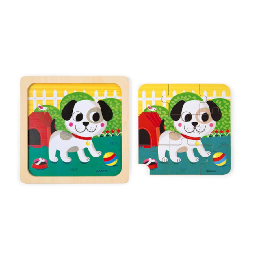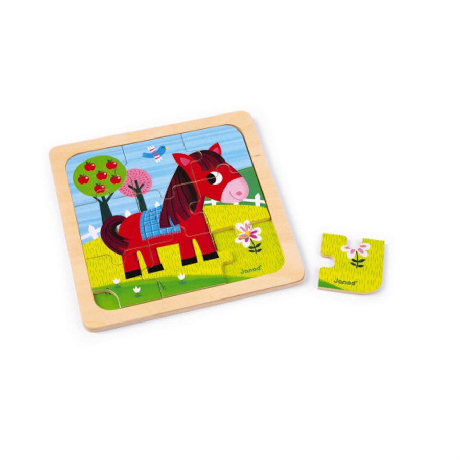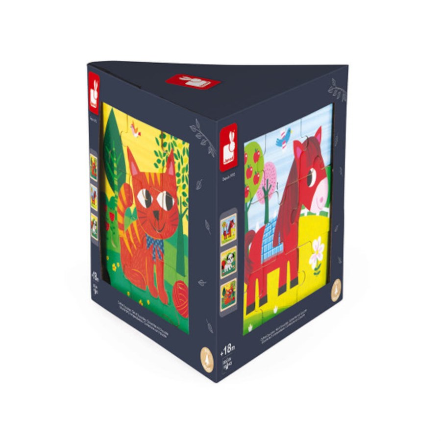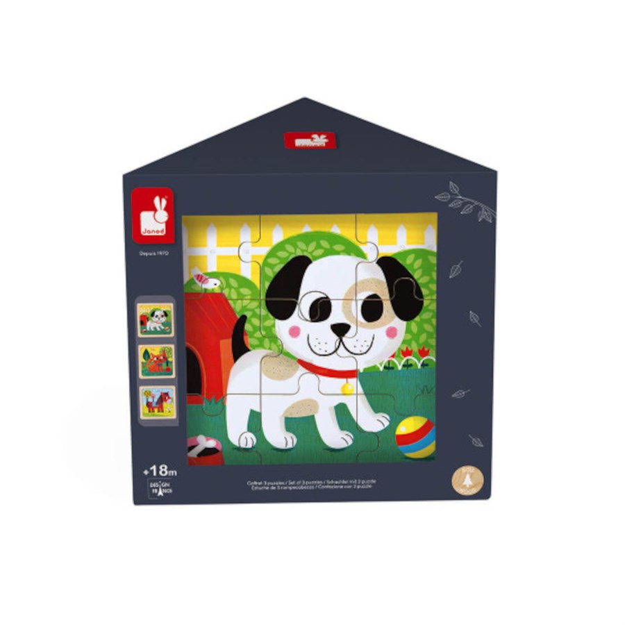 Цікавий набір пазлів французького бренду іграшок Janod. В наборі 27 деталей, з яких можна зібрати 3 картинки. Для кожного зображення передбачено по 9 деталей. На кожному з пазлів зображені свійські тваринки: цуценя, лоша та кошеня. За допомогою такої іграшки діти вивчать назви тварин, покращать моторику, розвинуть уважність і навчаться встановлювати причинно-наслідковий зв'язок. Деталі пазлу покриті безпечними фарбами на водній основі. Іграшка для дітей від 1,5 року.