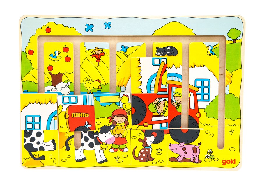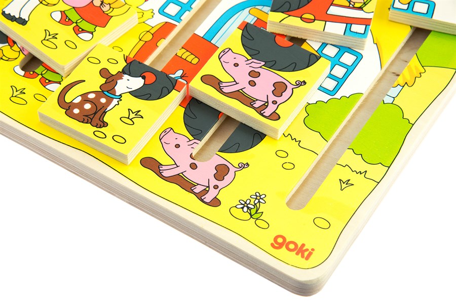 Дерев’яна розвиваюча гра «Наша ферма» німецького виробника іграшок goki вирізняється своєю незвичайністю. Такий вид пазлів не легкий, але і не занадто важкий. Пазли допоможуть дитині розвинути навички стратегії і тактики. Усі деталі великі, надійно закріплені, при цьому легко пересуваються. «Наша ферма» передбачає збудувати логічний ланцюжок подій і в певному порядку пересувати деталі так, щоб скласти картинку. Малюнок в основі гри допоможе дитині зорієнтуватись в сюжетній лінії та навести лад на фермі. Усі частини гри зроблені з натуральної деревини, вкритої нетоксичними фарбами на водній основі.