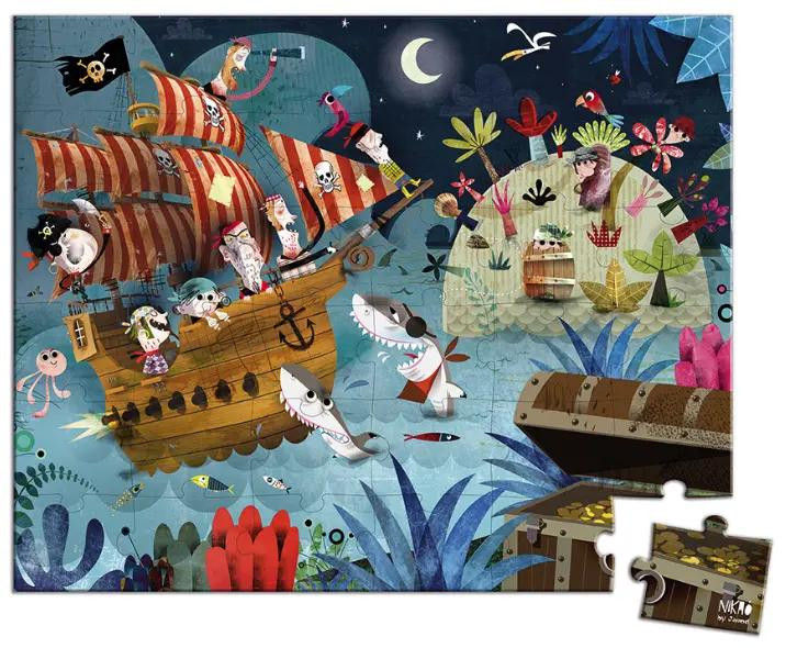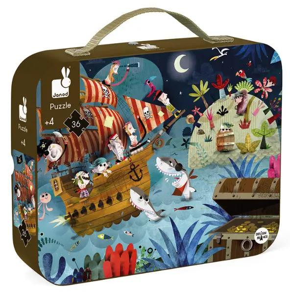 З допомогою пазлу Janod можна влаштувати справжнє полювання за скарбами. Яскрава картинка з оригінальним сюжетом, який активізує фантазію і стимулює мислення. Пазл складається з 36 деталей; вони картонні, цупкі і дуже якісні. Весь набір у стильній валізці з ручкою. Всередині валізки ви знайдете деталі для складання картинки і власне сам постер із зображенням пазлу. Деталі пазлу картонні; вони покриті безпечними фарбами на водній основі. Іграшка для дітей від 4 років.