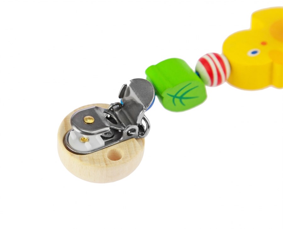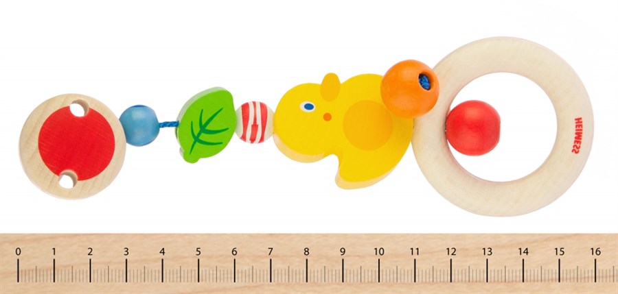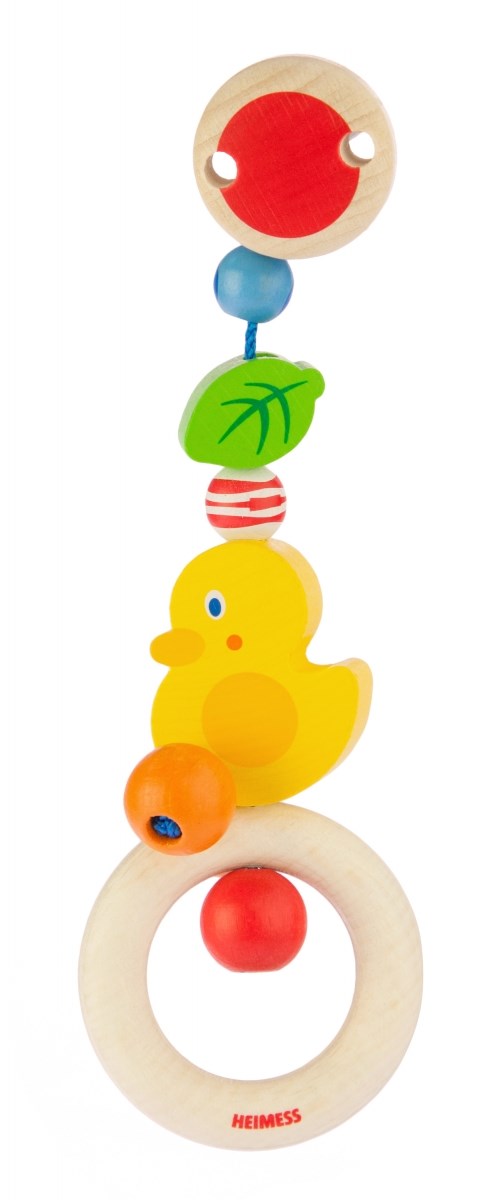 Кліпса «Качечка» від німецького бренду Heimess – яскравий та екологічний аксесуар на ліжечко або коляску новонароджених. Він вироблений з дерев’яних елементів та металевої гіпоалергенної кліпси. Усі частини безпечні і оброблені дуже якісно. Дерев’яна кліпса має також важливу розвиваючу функцію. Вона допоможе дитині розвити зір, моторику рук, сприйняття кольору та форм.