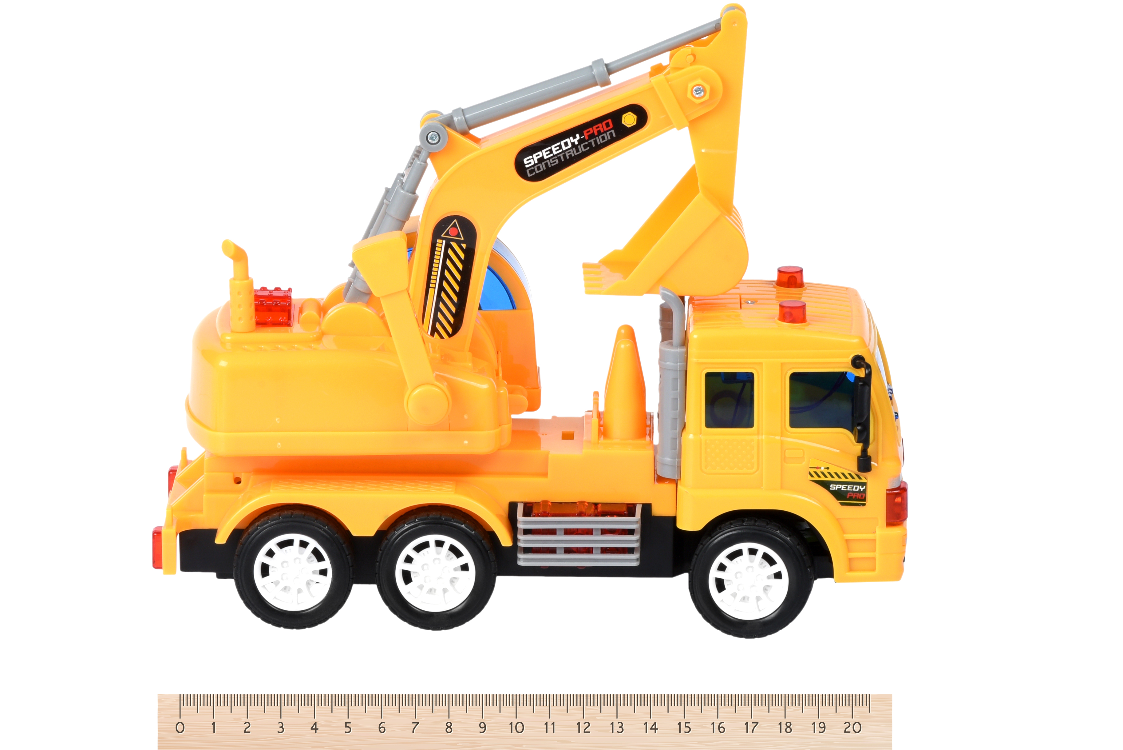Машинка на радіокеруванні «Вантажівка з ковшем» із світлом та звуком – це точна іграшкова копія реальної професійної техніки для будівництва або ремонтних робіт. Машинка від Same Toy стане головною фігурою у дитячих іграх про будівельні майданчики. Така модель дасть технічні знання про те, як функціонують екскаватори, із якими звуками. Вантажівка з ковшем миттєво реагує на сигнали пульта управління, тому керувати буде надзвичайно весело та цікаво. Транспортний засіб має повний набір функціональних характеристик: машина їде вперед, назад, розгортається, лампочки мерехтять, лунають звуки характерні робочому процесу вантажівки, механізм із ковшем регулюється вручну, що додатково розвиватиме дрібну моторику. Екскаватор на радіокеруванні захопить і дітей і дорослих, іграшка розвиватиме мислення, окомір, моторику, швидкість реакції, логіку, координацію рухів. Довжина машини 25 см, у набір входить 2 АА та 3 ААА батарейки, які живлять машину та пульт р/к. Для дітей від 3-х років.