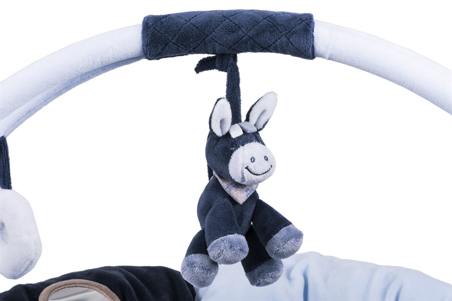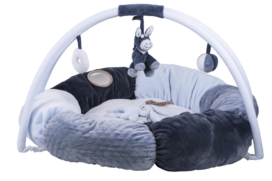 Розвиваючий килимок бельгійського виробника Nattou призначений для дітей із перших місяців від народження. Килимок у вигляді своєрідного кругу з м’якими подушками виготовлений із гіпоалергенного матеріалу, не здатного заподіяти шкоди здоров’ю дитини, - поліестеру. Виріб розміром 87 х 87. Блакитні, пастельні відтінки килимка гармонійно доповнять інтер’єр будь-якої дитячої кімнати. Килимок оснащений натяжними дугами з підвісними елементами. Лежачи на килимку і розглядаючи підвіски, дитина розвиватиме безліч корисних навичок і умінь. Крім того, завдяки напрочуд приємному  і ніжному на дотик матеріалу малята почуватимуться дуже комфортно і затишно. Матеріал основи не тонкий, тому дитині не буде холодно, якщо килимок розміщати на підлозі. За розвиваючим килимком Nattou  легко доглядати, можна прати в ручному режимі за температури 30°.