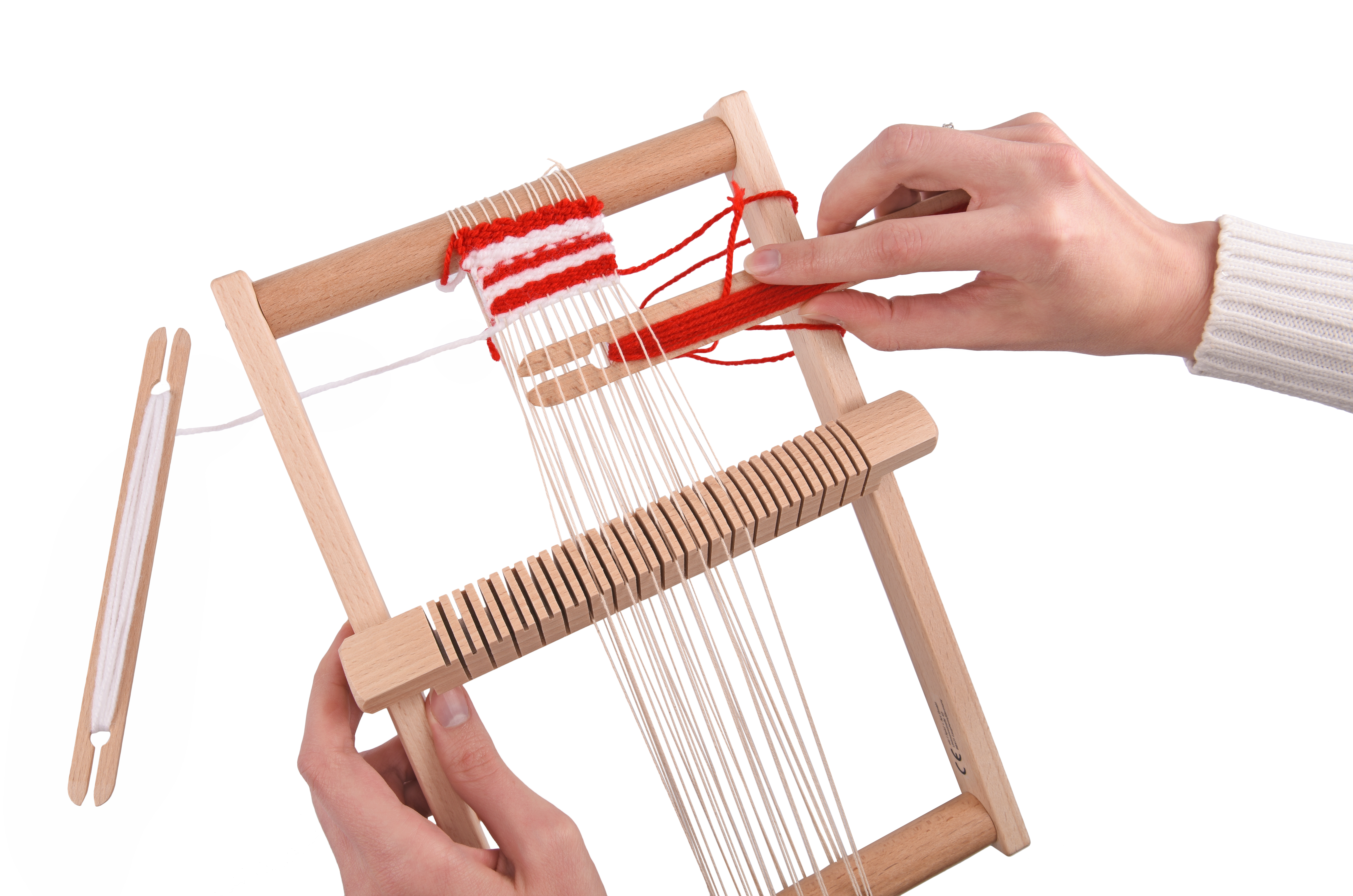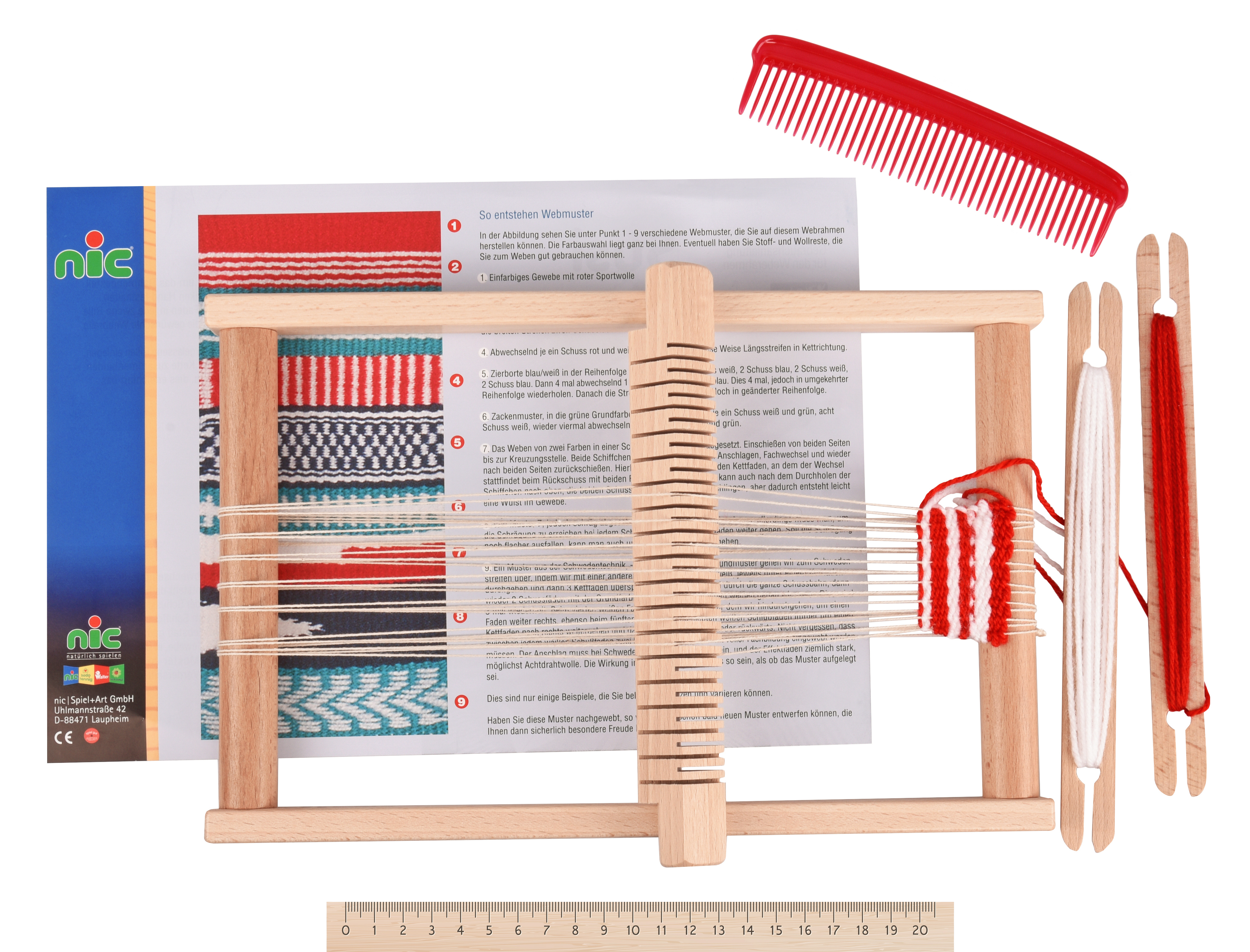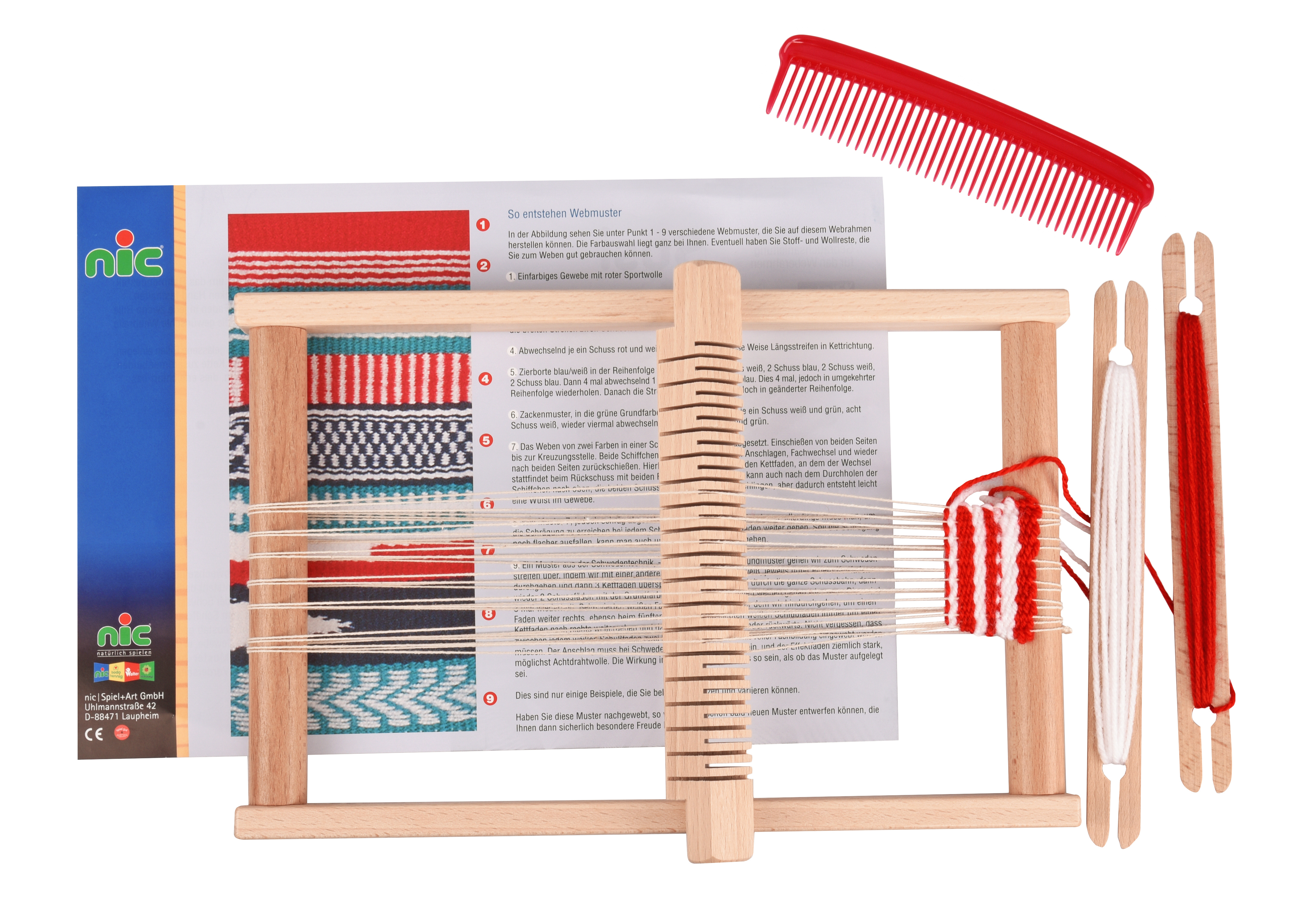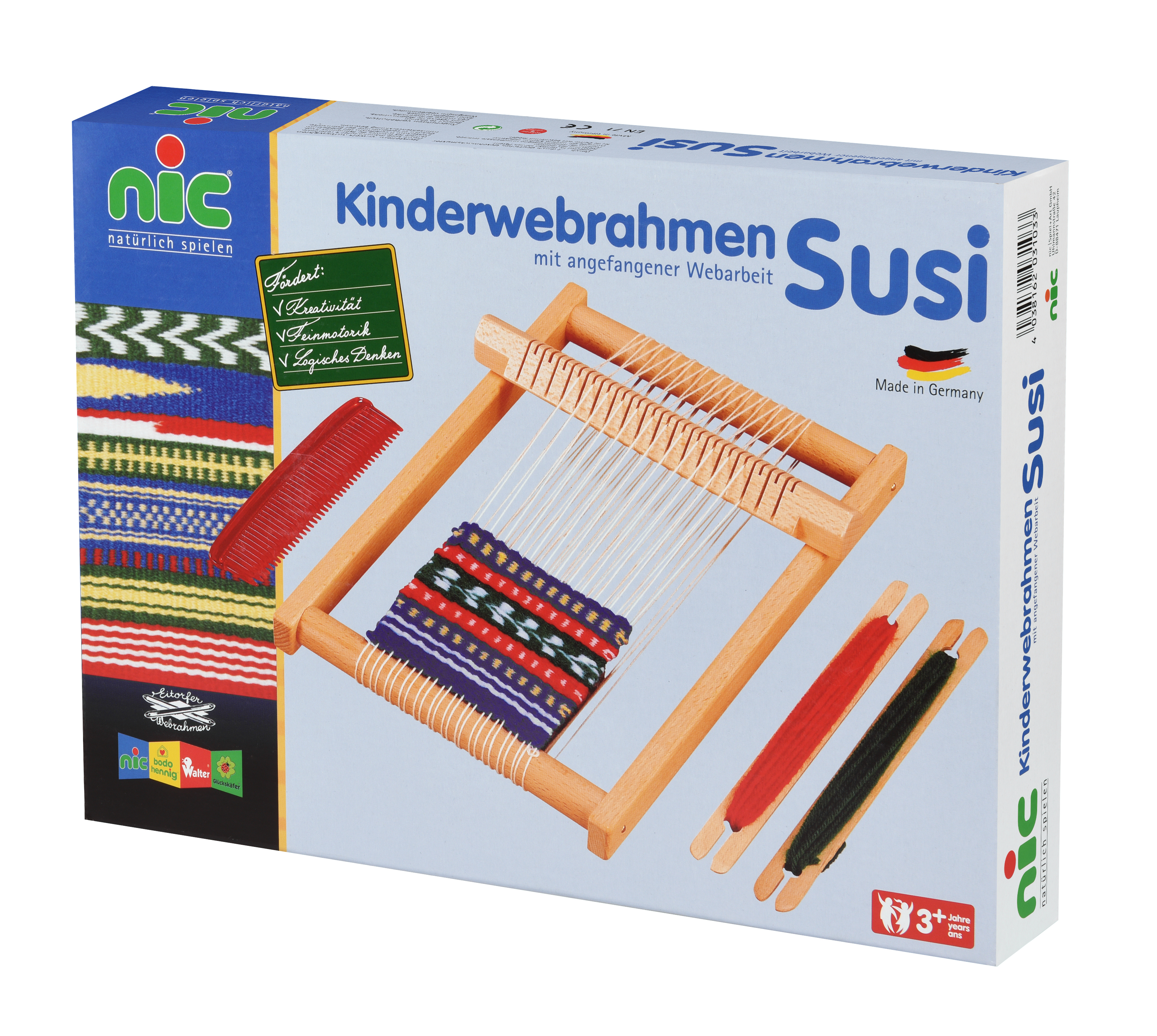 Кожна дівчинка змалку мріє створити власні шедеври рукоділля. Ткацький набір «С’юзі» німецького виробника іграшок nic для дітей від 3-х років допоможе втілити дитячі мрії. Ткацький верстат дозволить дитині власноруч створити полотно з візерунками, підставки під вазочки, маленькі скатертини тощо. Комплект для рукоділля постачається у надійній фірмовій коробці. Ручний верстат вже зібраний, маленька частина полотна сплетена – це допоможе дитині швидше розібратись у роботі машини. Більшість елементів вироблена із натурального дерева, всі деталі якісно оброблені. Довжина верстату - 30 см, ширина з ремізкою – 21 см. Ширина ткацької площі – до 17 см. Вали для перемотки ниток регулюються вручну.