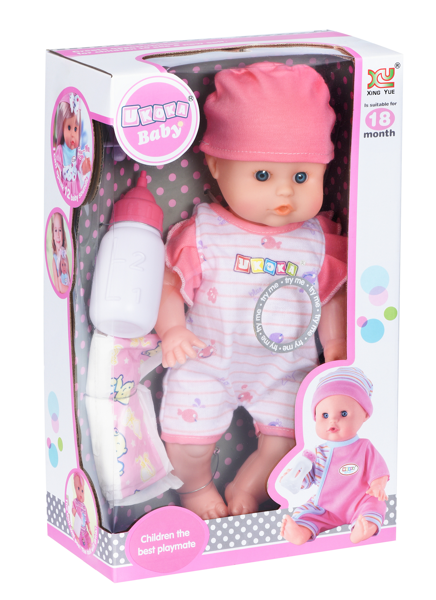 п'є з пляшки, зі звуковими ефектами, ходить на горщик