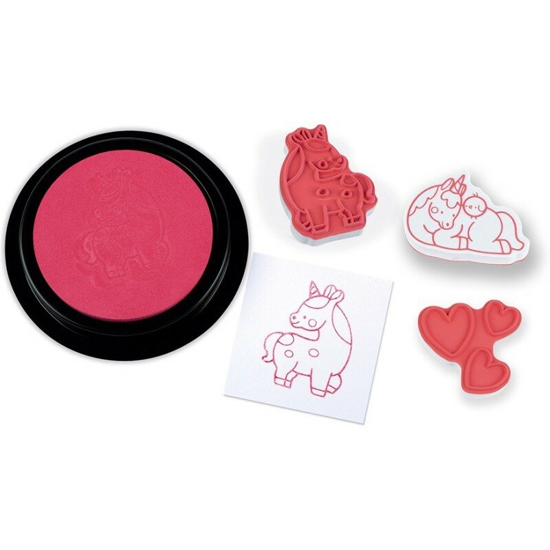 Набір для творчості французького бренду Janod Штампи Єдиноріг містить 15 зручних штампів різної форми з чарівною графікою з чарівного світу єдинорогів: рослини, солодощі, єдинороги. З їх допомогою ви можете створювати унікальні історії, а відображені зображення можна додатково розфарбовувати. Штампи зроблені з більш приємного на дотик еластичного пінопласту і гумової поверхні, на якій нанесено зображення штампування. У комплект також входить подушка з рожевими чорнилом.