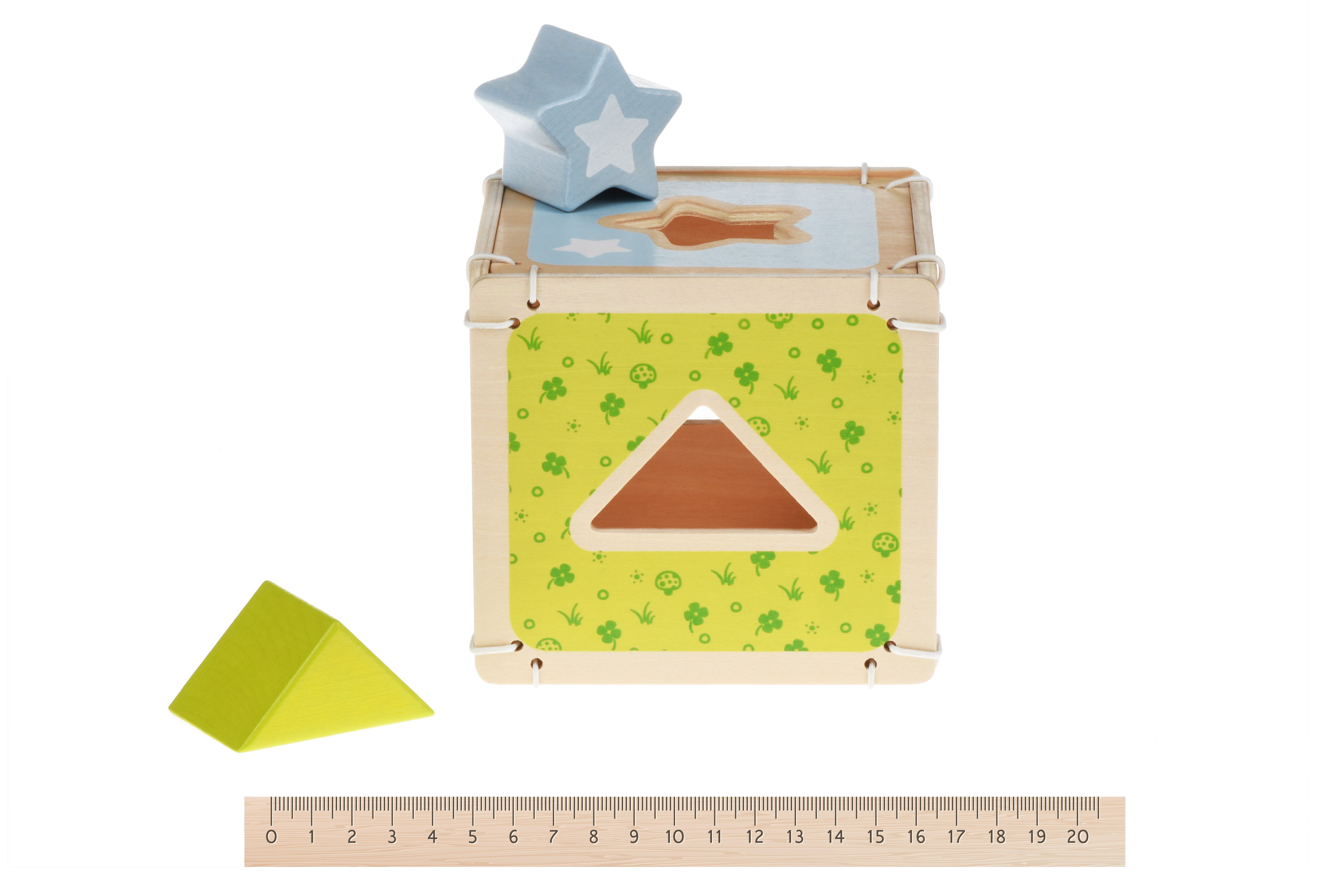 Сортер в формі куба. На сторонах дерев'яного різнобарвного куба є прорізи, форма яких відповідає 5 ф