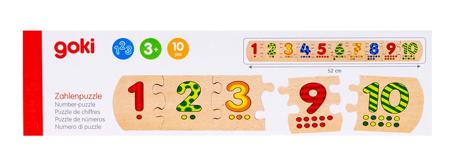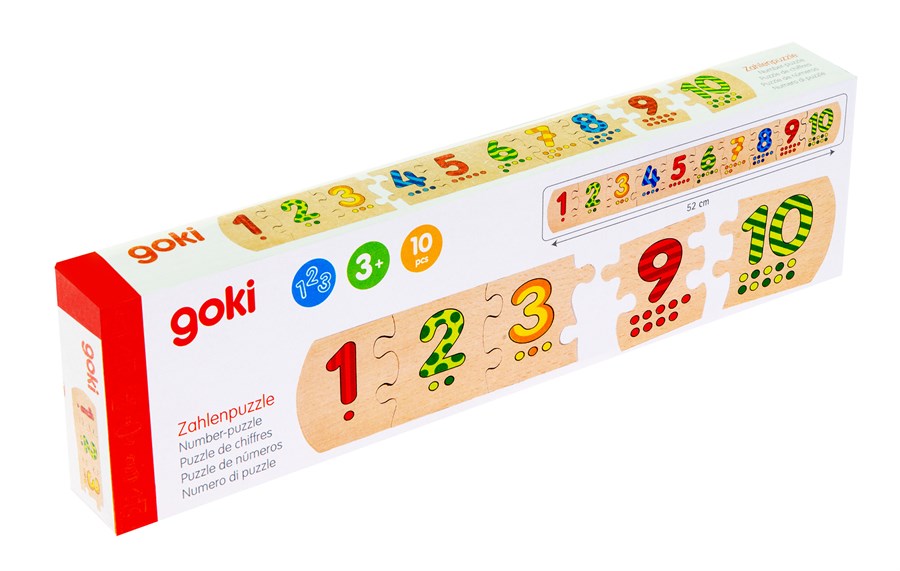 Навчись рахувати граючи! Дитяча гра-пазл німецького виробника іграшок goki створена для навчання дітей основам рахунку. Дерев’яні пазли складаються у цифровий рядок лише у випадку послідовного розташування цифр. Всього в набір входить 10 деталей, по 1 для кожної цифри. Вони яскраві, приємні на дотик та абсолютно безпечні для дитини. Розвиваюча гра «Вчимося рахувати» - це чудова гра на розвиток логічного мислення, дрібної моторики та сприйняття кольору.