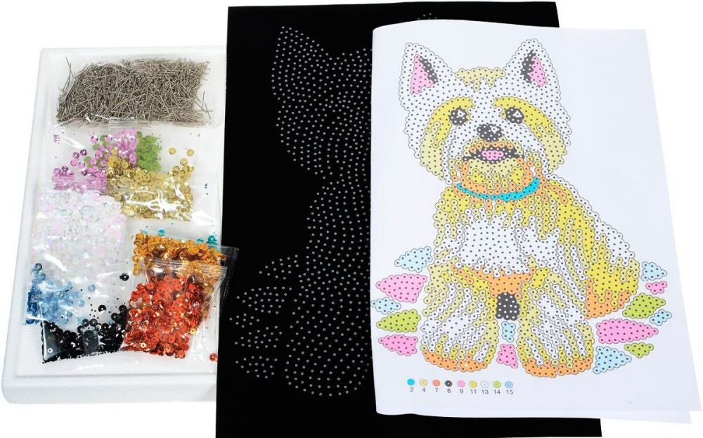 Вест-хайленд-вайт-тер'єр із паєток на чорній оксамитовій основі. Набір для творчості від Sequin Art дозволить вам вишити тау блискучу картину і прикрасити нею вашу кімнату. До основи із пінопласту, згідно зі схемою, прикріплюються кольорові паєтки за допомогою маленьких шпильок. У висновку – ви отримаєте красиву, стильну, блискучу картину! У наборі: пінопластова основа 25х34 см, оксамитова база у крапку, упаковки з паєтками різних кольорів, шпильки та інструкція. «Вишивання» паєтками – цікавий та захопливий процес, який вимагає уважності, посидючості та охайності. Рекомендований вік: 8+