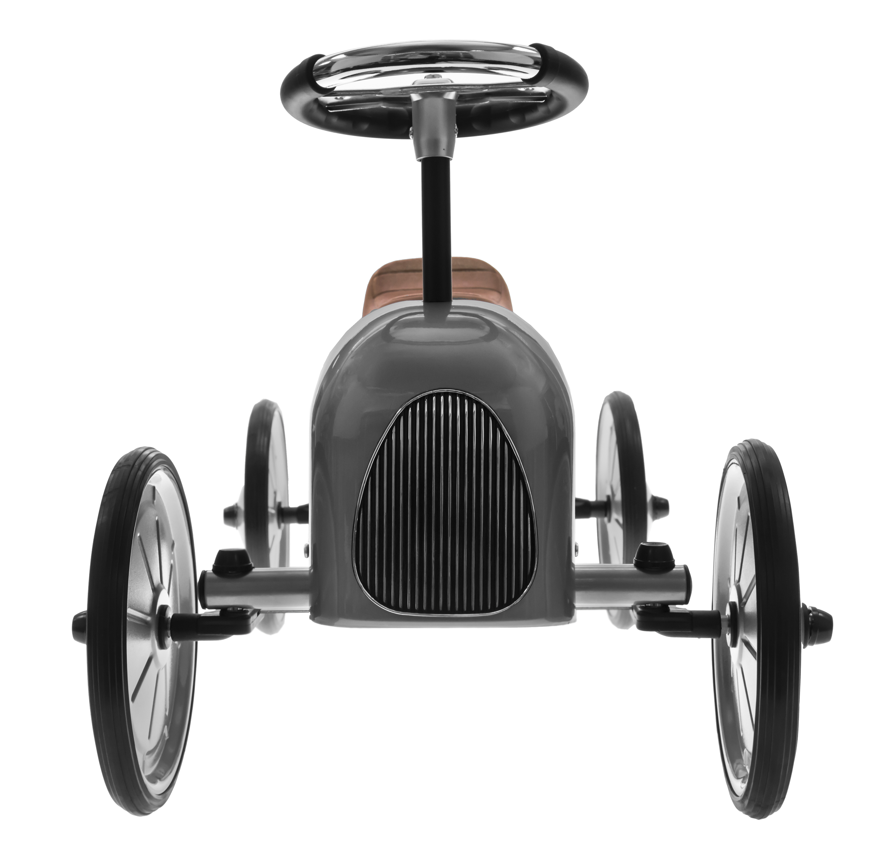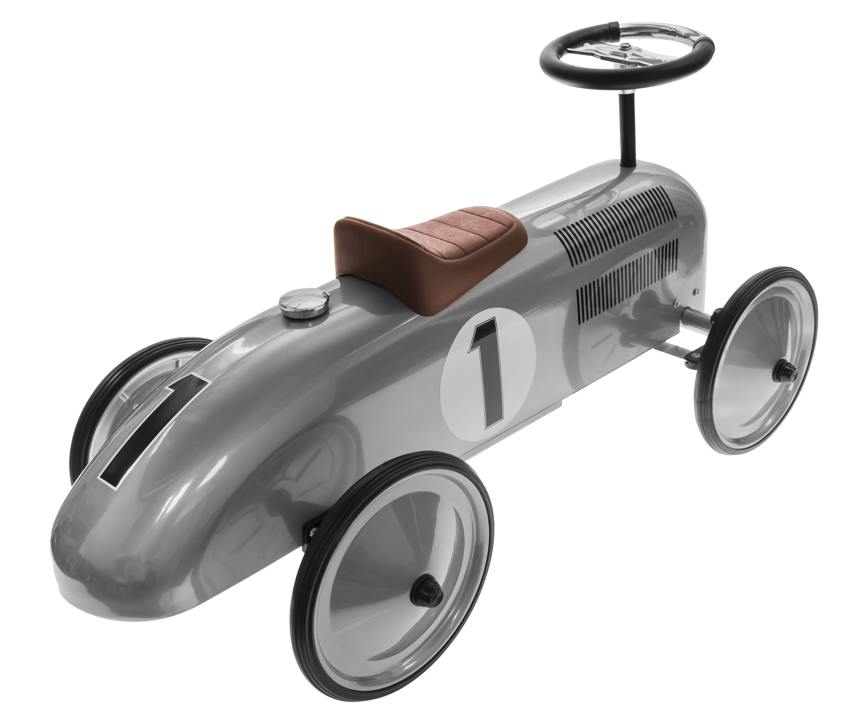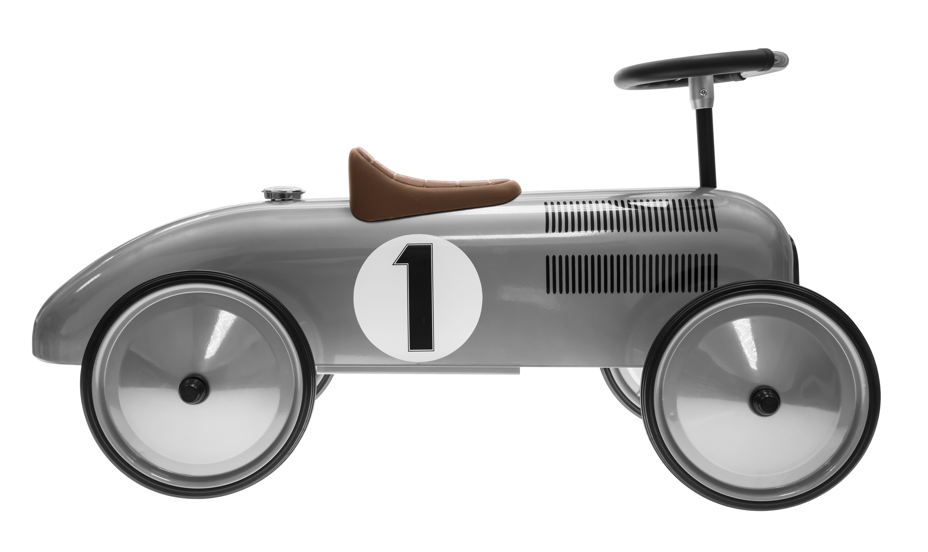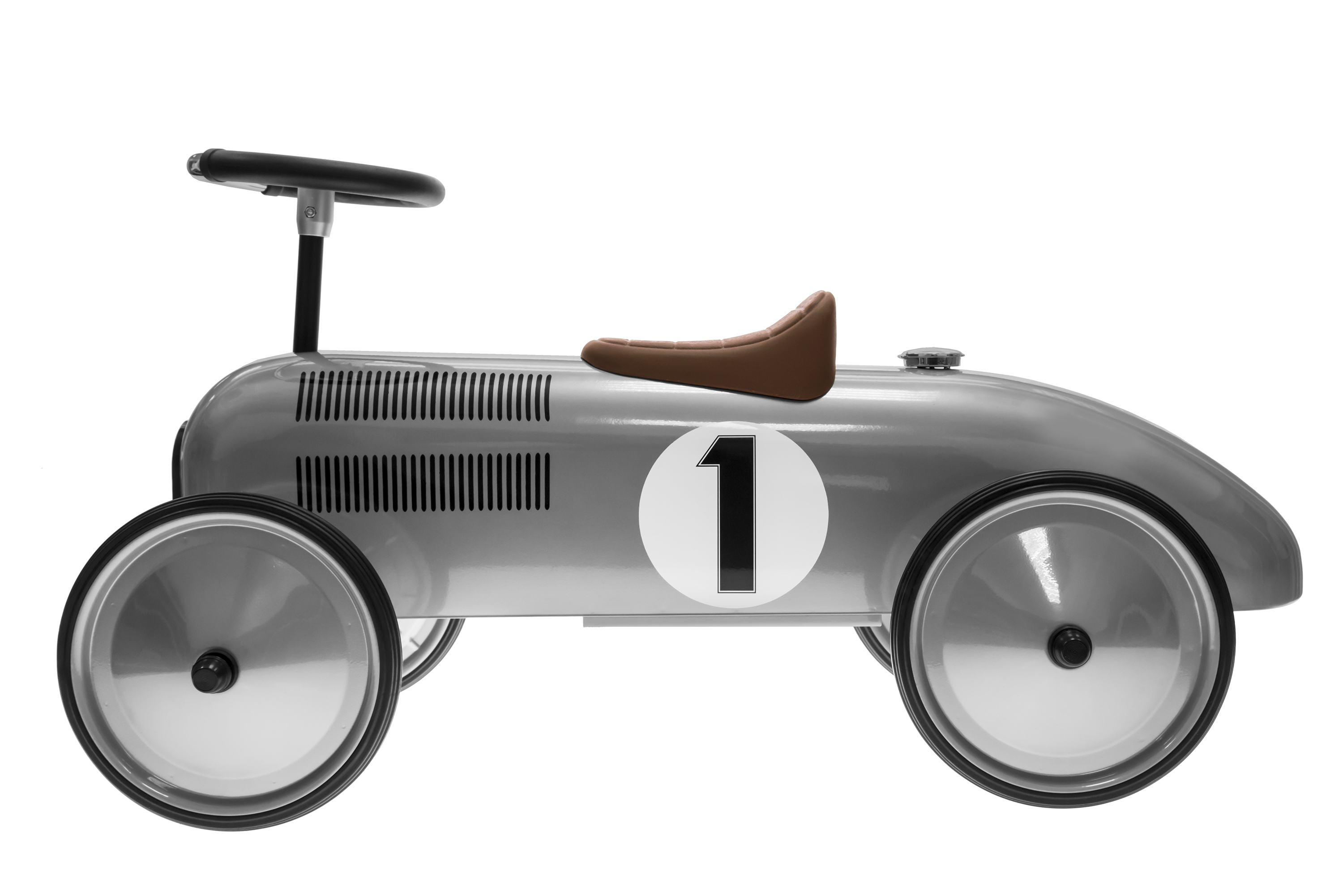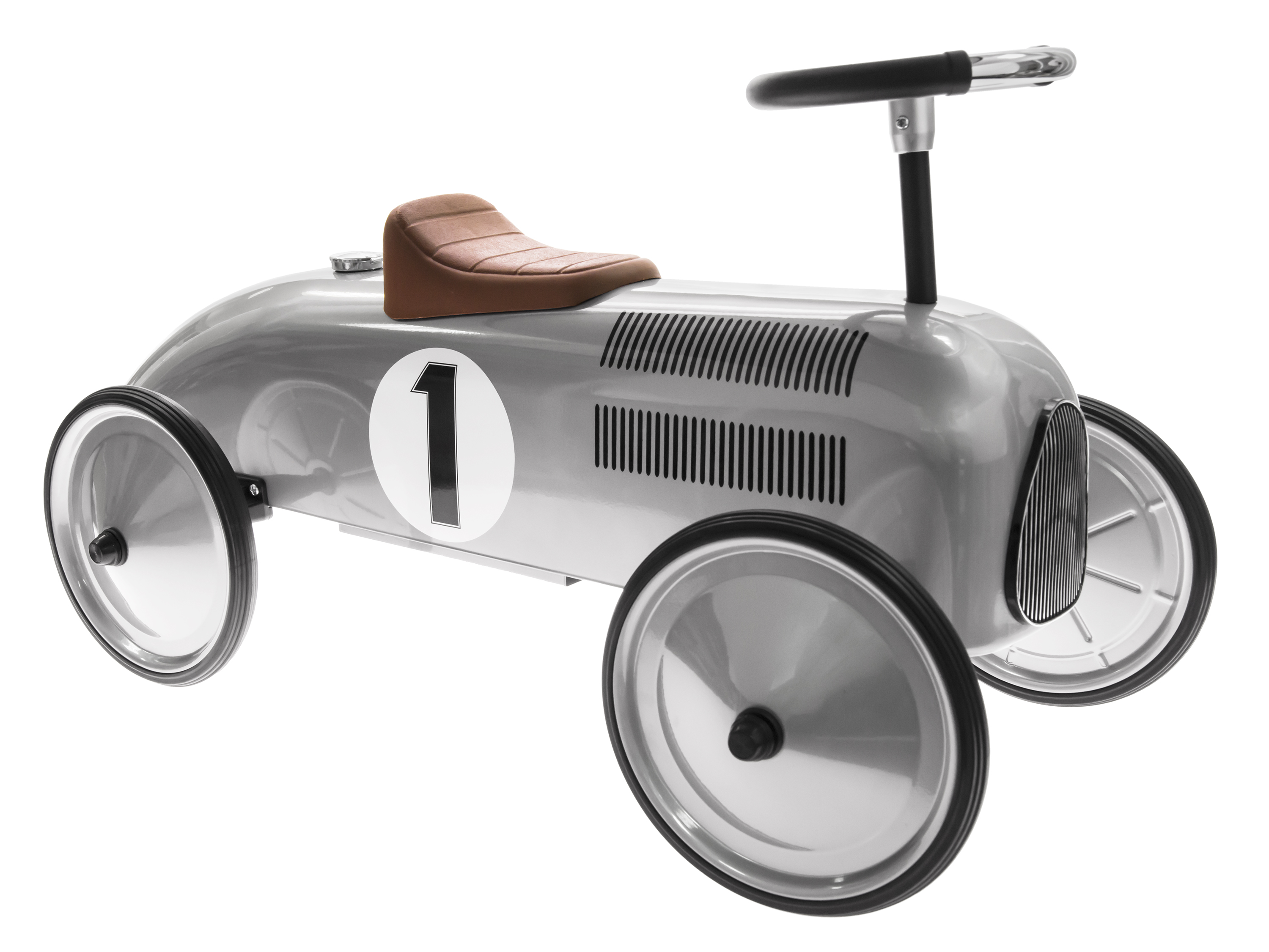 Толокар у стилі ретро німецького виробника іграшок goki спеціально розроблений для підвищення фізичної активності дітей. Корпус толокару зроблений з металу, його колір - сріблястий, він має гумові колеса, радіаторну решітку, пластикове сидіння та функціональне кермо. Цифра «1» яскраво виділяється на корпусі транспортного засобу і буде нагадувати дитині про її найвищі досягнення. Толокар вироблений професіоналами, тому його конструкція стійка та надійна. Толокар «Ретро» надзвичайно корисний для м’язів дитини, адже необхідно докладати певних зусиль, щоб пересуватись на «Ретро боліді».