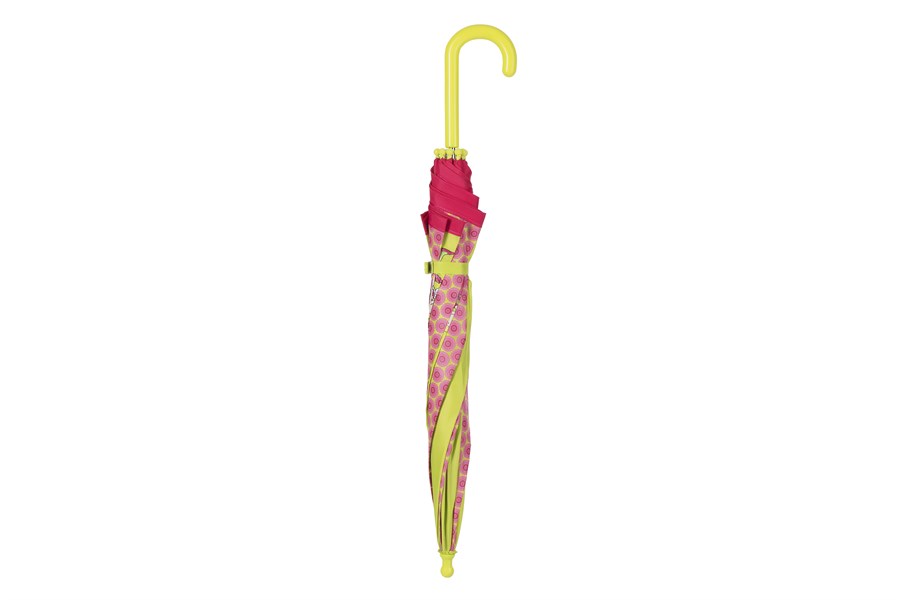 Яскрава парасолька-тростина від німецького бренду sigikid для дівчат, що люблять природу. Практичний аксесуар малиново-зеленого кольору із зображенням дівчинки та квітів. Механізм - напівавтомат. Кольоровий купол розкривається одним натисканням кнопки. Він вироблений із поліестеру, пластикові елементи – із поліпропілену, а спиці – металеві. Спиці під куполом захищені прозорими пластиковими чохольчиками, а на кінцях – пластиковими наконечниками, тому парасолька абсолютно безпечна для дітей і оточуючих.