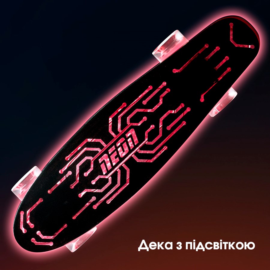 Скейтборд Hype бренду Neon – транспортний засіб для дітей від 5 років. Скейт здатен витримати навантаження до 100 кг. Конструкція міцна та надійна. Усі деталі розроблені так, щоб катання було максимально безпечним. Платформа наждачна та абсолютно не ковзка. Особливість скейтів Neon Hype – яскрава світлодіодна підсвітка дошки. Скейт має дуже стильний вигляд: дошка напівпрозора та з наждачним покриттям. Колеса поліуретанові, добре котяться по асфальту та іншій рівній поверхні.