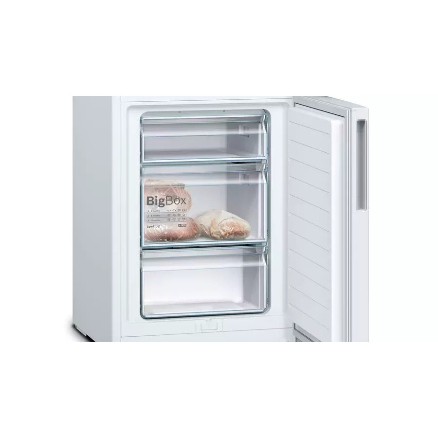 Холодильник з морозильною камерою Bosch KGV39VW316 виготовлений в дводверному корпусі традиційного білого кольору з інтегрованими вертикальними ручками. Він відноситься до класу енергоспоживання А++ і обладнаний поршневим компресором, що працює з низьким рівнем шуму - до 39 дБ. Датчики FreshSense забезпечують контроль і підтримку заданої температури. У холодильній камері, обємом 249 літрів, є 5 скляних полиць і відділення для овочів і фруктів Vita Fresh з регульованою вологістю. Вона розморожується в автоматичному (крапельному) режимі. Морозильний відсік, ємністю 94 літри, розташований знизу. Він містить 3 прозорих висувних контейнери, в тому числі габаритний BigBox, і оснащений системою швидкого заморожування SuperFreezing. Технологія LowFrost знижує утворення льоду і паморозі в камері, збільшуючи час між розморожуванням. Холодильник з морозильною камерою Bosch KGV39VW316 управляється електронними кнопками, а значення обраної температури відображається на внутрішньому дисплеї.