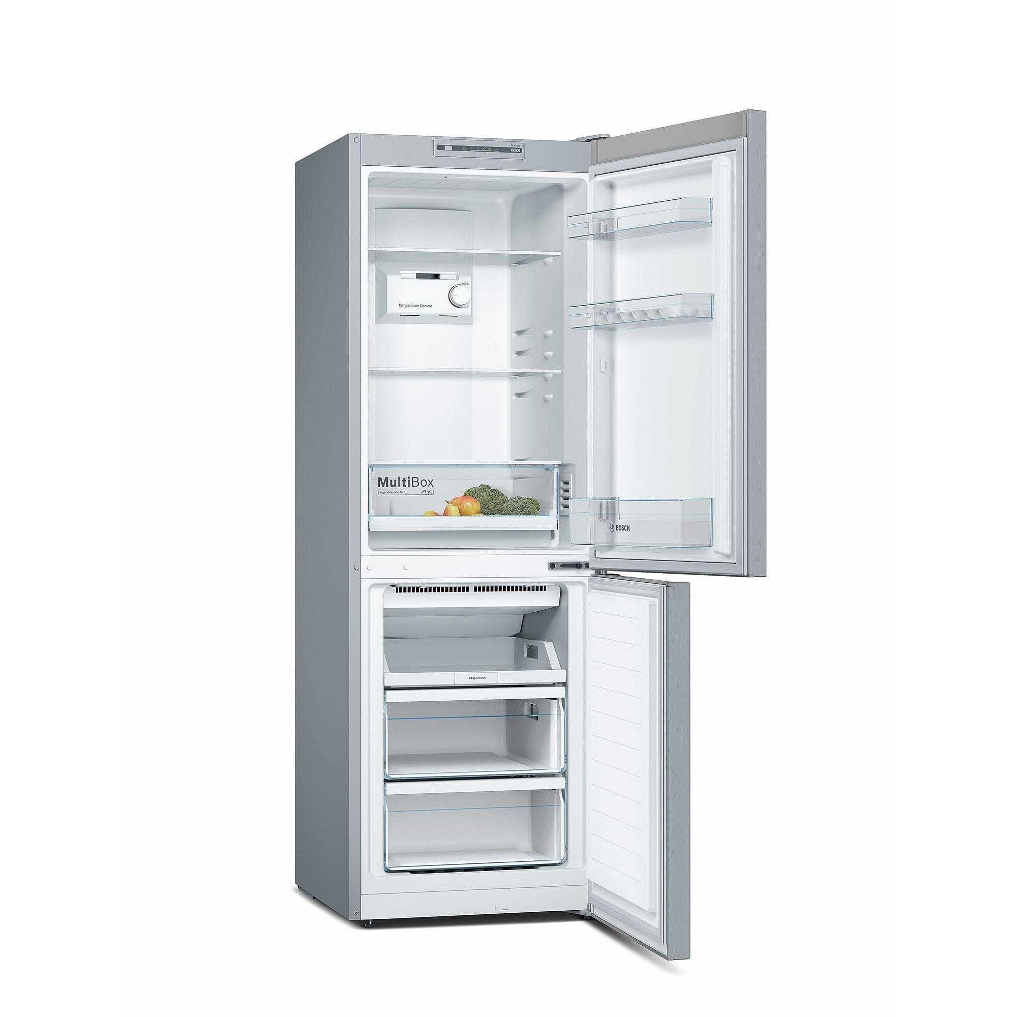 Двокамерний холодильник Bosch KGN33NL206 з нижнім розташуванням морозильної камери і системою рівномірного багатопотокового охолодження MultiAirflow дозволяє зберігати продукти, зберігаючи їх якість протягом тривалого часу. Температуру холодильної камери, обємом 192 літри, і морозильної камери, обємом 87 літрів, можна задавати окремо, а датчики FreshSense постійно контролюють і підтримують її. Аби при додаванні нових продуктів в морозильну камеру не розморожувати інші, функція SuperFreezing забезпечить швидке заморожування, після чого автоматично відключається. Сучасна система NoFrost позбавить господиню від необхідності регулярного розморожування - це робиться автоматично і постійно. Для збереження корисних властивостей овочів і фруктів в холодильній камері використовується спеціальний прозорий ящик MultiBox з хвилястим дном. Bosch KGN33NL206 збереже холод всередині при відключенні електроенергії на 19 годин і відрізняється тихою роботою компресора - 42 дБ (рівень тихої розмови).