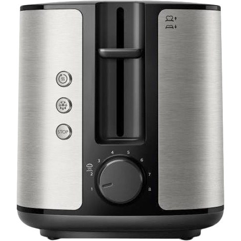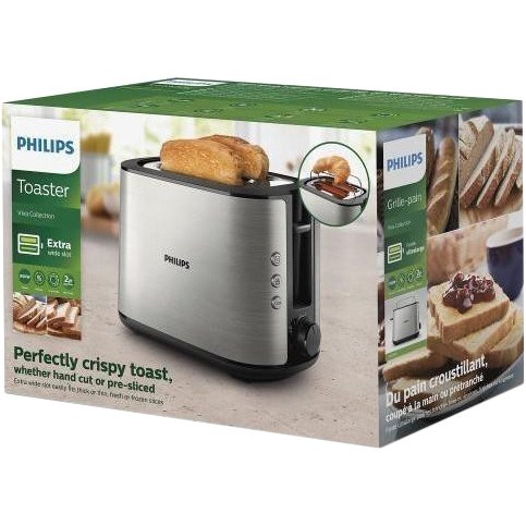 Тостер Philips HD2650/90 виготовляється в сучасному лаконічному дизайні у міцному металевому корпусі овальної форми. У ньому є два широкі слоти, оснащені механізмом автоматичного центрування, завдяки чому можна одночасно обсмажувати скибочки різної товщини. Модель потужністю 950 Вт функціонує у восьми режимах нагріву, які задаються ергономічним поворотним перемикачем. Вона також швидко розігріє готовий підсмажений хліб. Високий підйом тостів дозволяє безпечно, не обпалюючись, діставати невеликі скибочки, а на висувній дротяній підставці зручно підігрівати булочки та круасани. Користувач може готувати тости із замороженого хліба без попереднього розморожування – у приладі є відповідна автоматична функція. Будь-якої миті приготування зупиняється кнопкою скасування, а якщо хліб застряє, то відбувається автоматичне відключення пристрою. Тостер Philips HD2650/90 зручний для зберігання – він не займає багато місця, при цьому шнур живлення змотується у спеціальний відсік.
