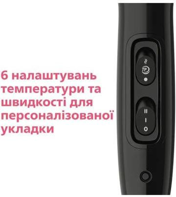 Фен Philips BHD274/00 виготовлений в стильному чорному кольорі в елегантному лаконічному дизайні. У ньому встановлено надійний двошвидкісний мотор потужністю 2200 Вт, який здатний розганяти повітря до 130 км/год для швидкої і ефективної сушки і укладки. Прилад має технологію ThermoProtect, завдяки якій встановлюється оптимальна температура сушки волосся, що не допускає їх перегріву, і постійна потужність повітряного потоку. Для закріплення укладки є функція холодного обдуву, при якому волосся не втрачає природну вологість і не порушується їх структура. Вбудований іонізатор генерує негативно заряджені іони, які знімають статичну електрику і покращують стан волосся. Крім того, закриваються волосяні лусочки, надаючи волоссю блиск, шовковистість і мякість. За допомогою дифузора створюваним локонам надається додатковий обєм і пружність, а насадка-концентратор з вузькою 9-міліметровою щілиною забезпечить фіксацію окремих пасом. Фен Philips BHD274/00 оснащений петлею для зберігання в підвішеному стані.