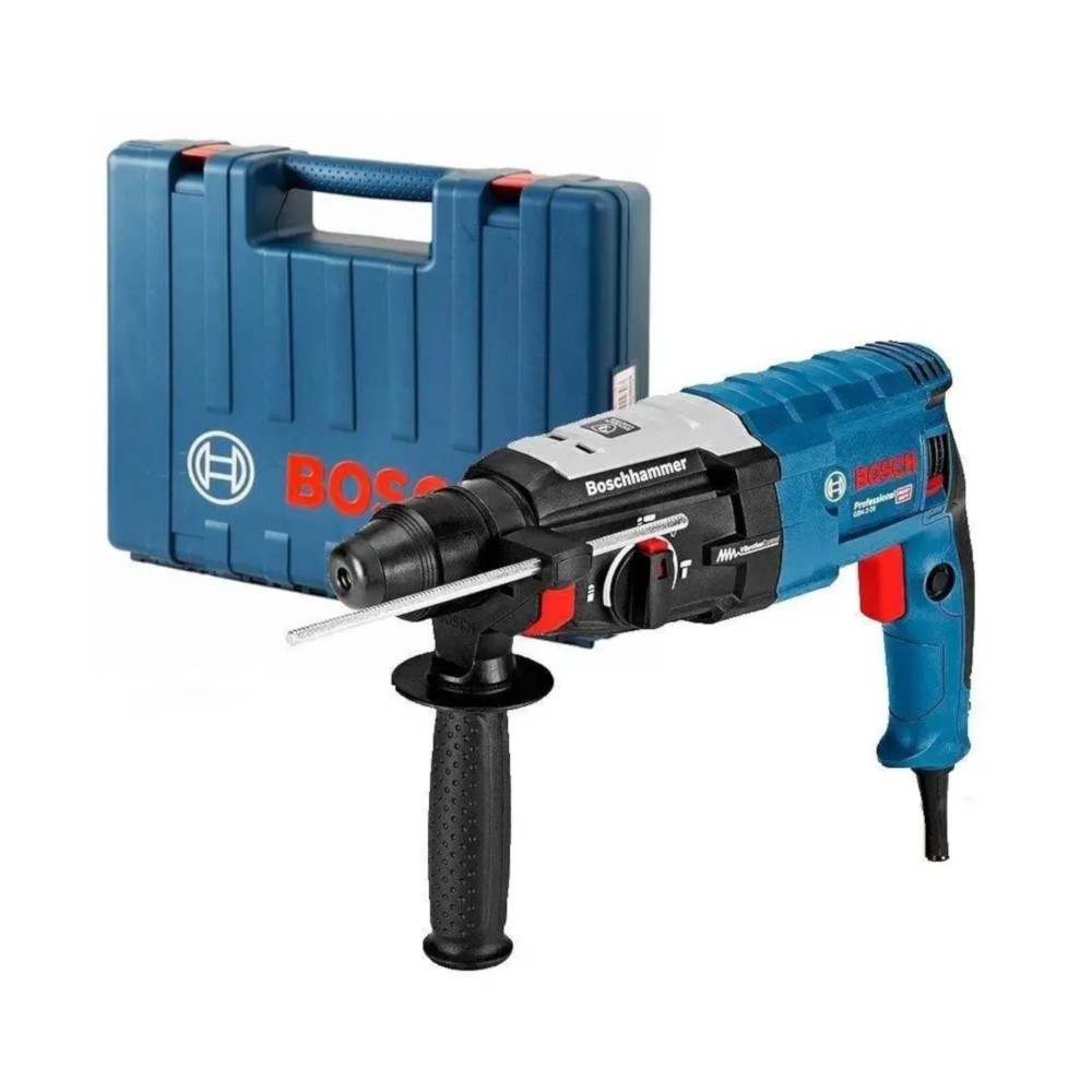 Перфоратор Bosch GBH 2-28 (0611267500) - якісна модель з хорошим набором функцій і продуманою конструкцією. Bosch GBH 2-28 (0611267500) віддають перевагу багато професіоналів, адже продукція даного виробника відома на ринку в усьому світі своєю надійністю і довговічністю. Дана модель виконана у вигляді конструкції з горизонтально розташованим двигуном і SDS-plus патроном, передбачає наявність бічної рукоятки і глибиноміра, а також кейса в комплекті для безпечного транспортування та зберігання. В процесі експлуатації з таким перфоратором є можливість використання трьох найбільш затребуваних режимів роботи - удар, свердління, удар + свердління, функції реверсу і регулювання обертів. Його швидкість обертання досягає максимуму при значенні 1300 об/хв, швидкість ударів при 4000 об/хв, при цьому сила удару становить 3,2 Дж. Ще однією перевагою Bosch GBH 2-28 (0611267500) є його невелика вага 2,9 кг.