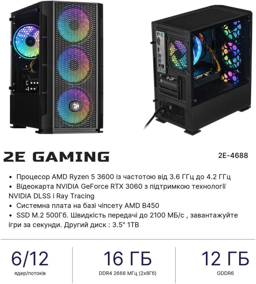 Комп’ютер персональний 2E Complex Gaming AMD R5-3600, 16Gb, F500GB+1TB, NVD3060-12, B450, GB700, 650W, FreeDos