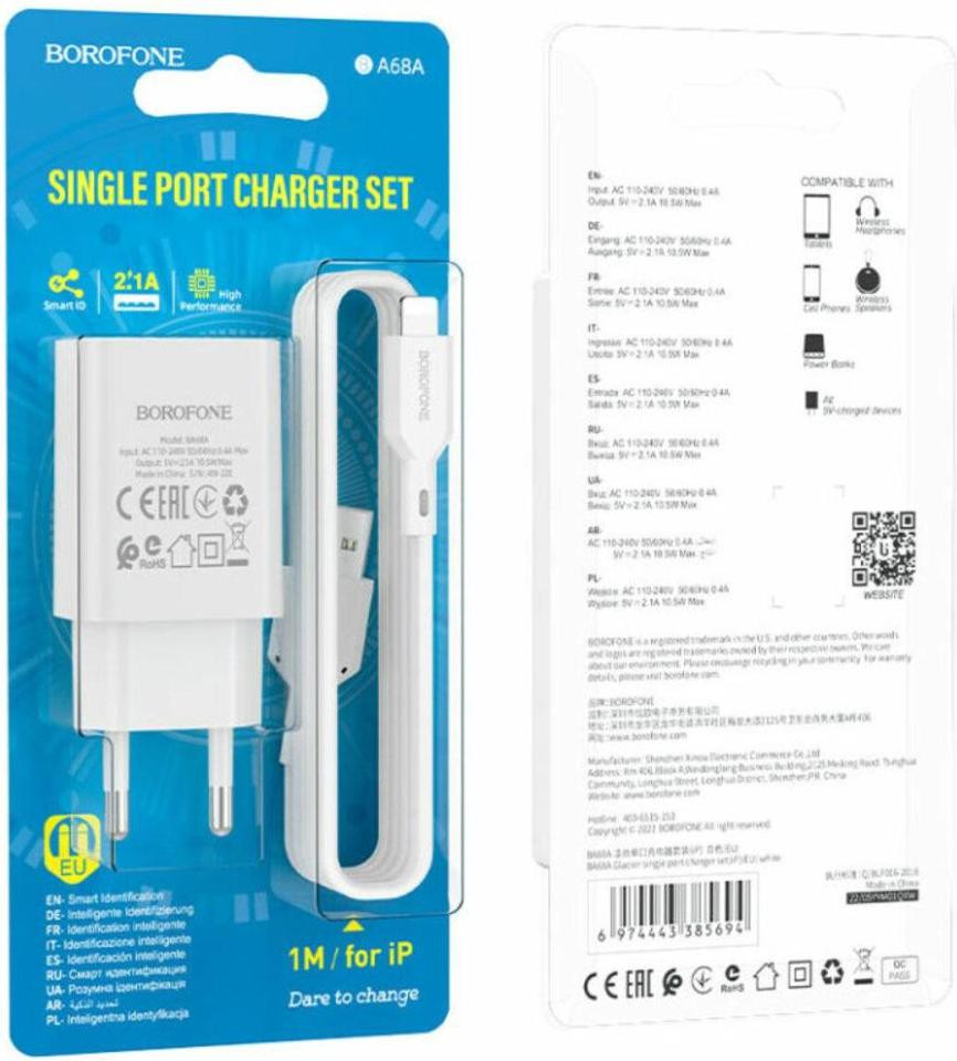 Мережевий зарядний пристрій BOROFONE BA68A Glacier single port charger set(iP) White