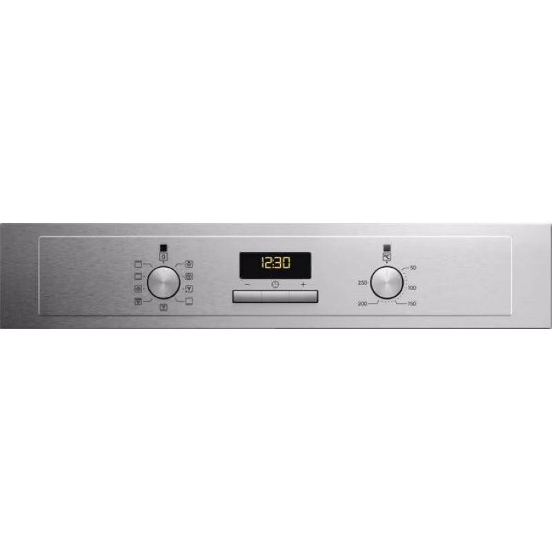 Духовка електрична Electrolux EOF3H40X випускається в елегантному сучасному дизайні в кольорі нержавіючої сталі. Вона вбудовується в кухонну шафу і буде гармонійно виглядати в інтерєрі будь-якого стилю. Потужність підключення приладу класу енергоспоживання А становить 2790 Вт. Його камера обємом 72 літри обладнана грилем, конвекційним вентилятором SurroundCook і яскравим галогенним освітленням, а також містить знімні 5-позиційні дротяні направляючі. Вона закривається відкидними дверцятами з подвійним склінням з широкою зручною ручкою. Очищення внутрішньої поверхні від забруднень полегшується функцією AquaClean, яка розмякшує залишки їжі впливом пара. Модель функціонує в 9 режимах, виконуючи нагрівання від 50°C до 275°C. Управляється електрична духовка Electrolux EOF3H40X утоплюваними поворотними і кнопковими перемикачами. Її безпечне використання забезпечується вентилятором охолодження, який автоматично включається одночасно з пристроєм.