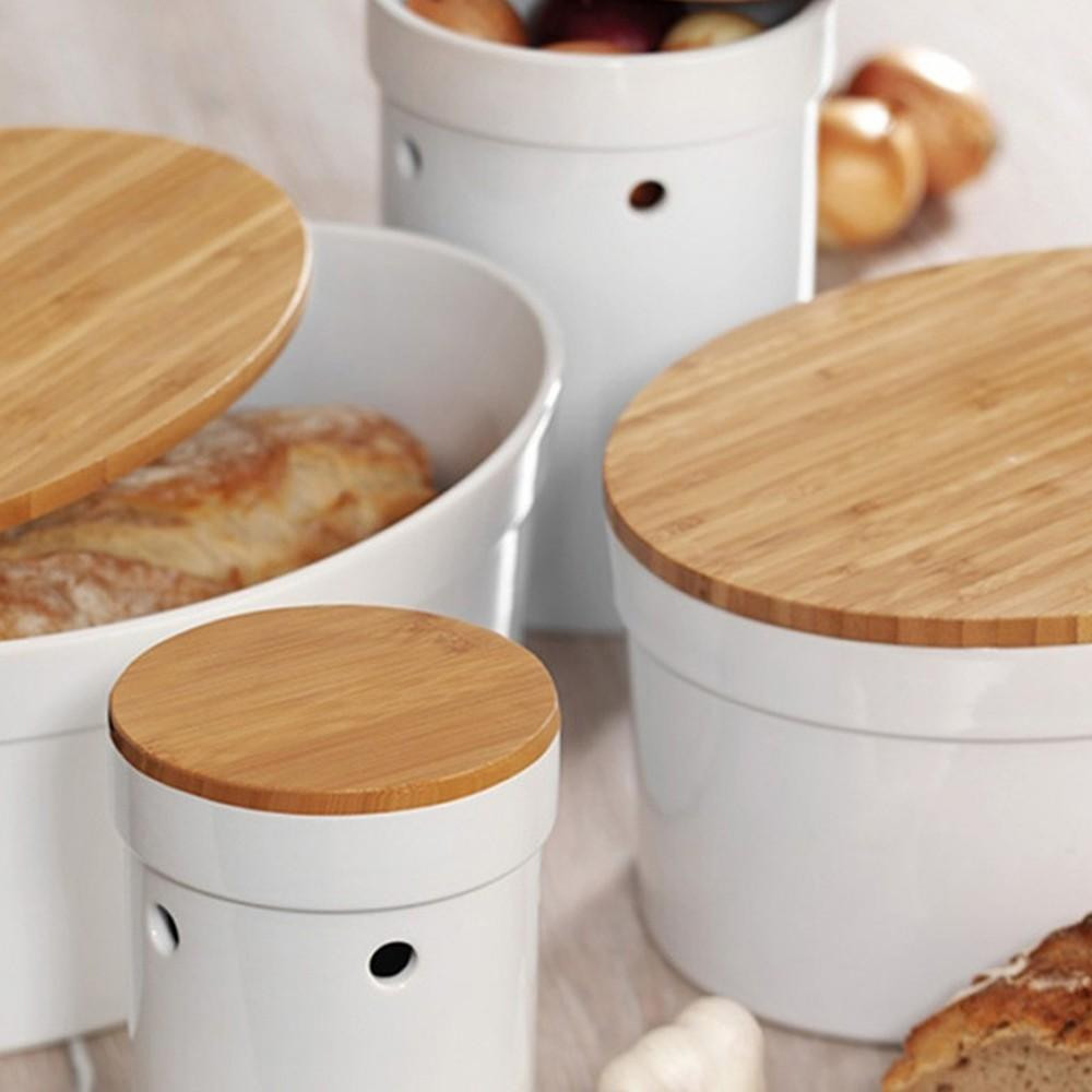 Ємність для зберігання цибулі Kela Salena виготовлена з кераміки, кришка - з бамбука. У такій ємност
