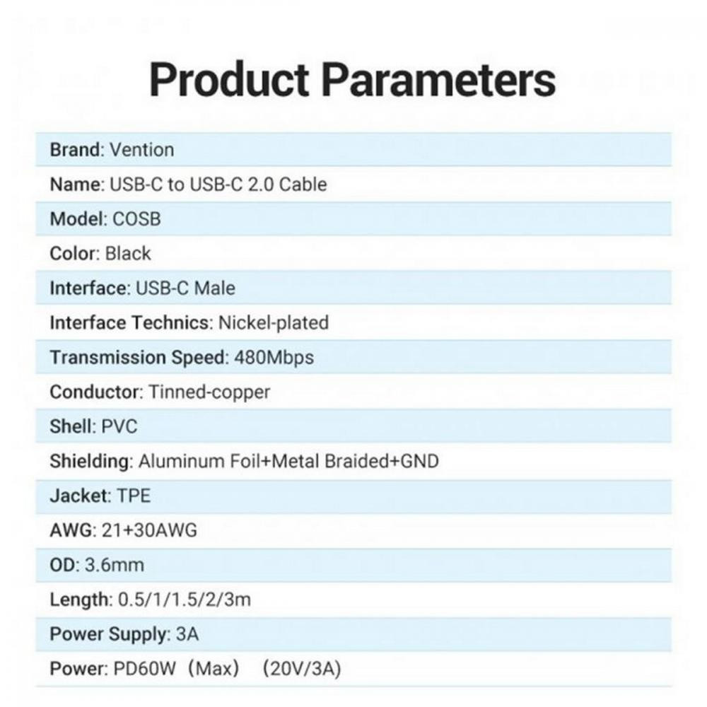 Кабель Vention USB 2.0 Type-C To Type-C 1.5M Black