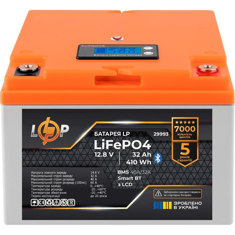Акумуляторна батарея LogicPower, LiFePO4, 12.8V, 32Ah, 410Wh, BMS 40А/32A, пластик, LCD, Smart BT (LP29993)