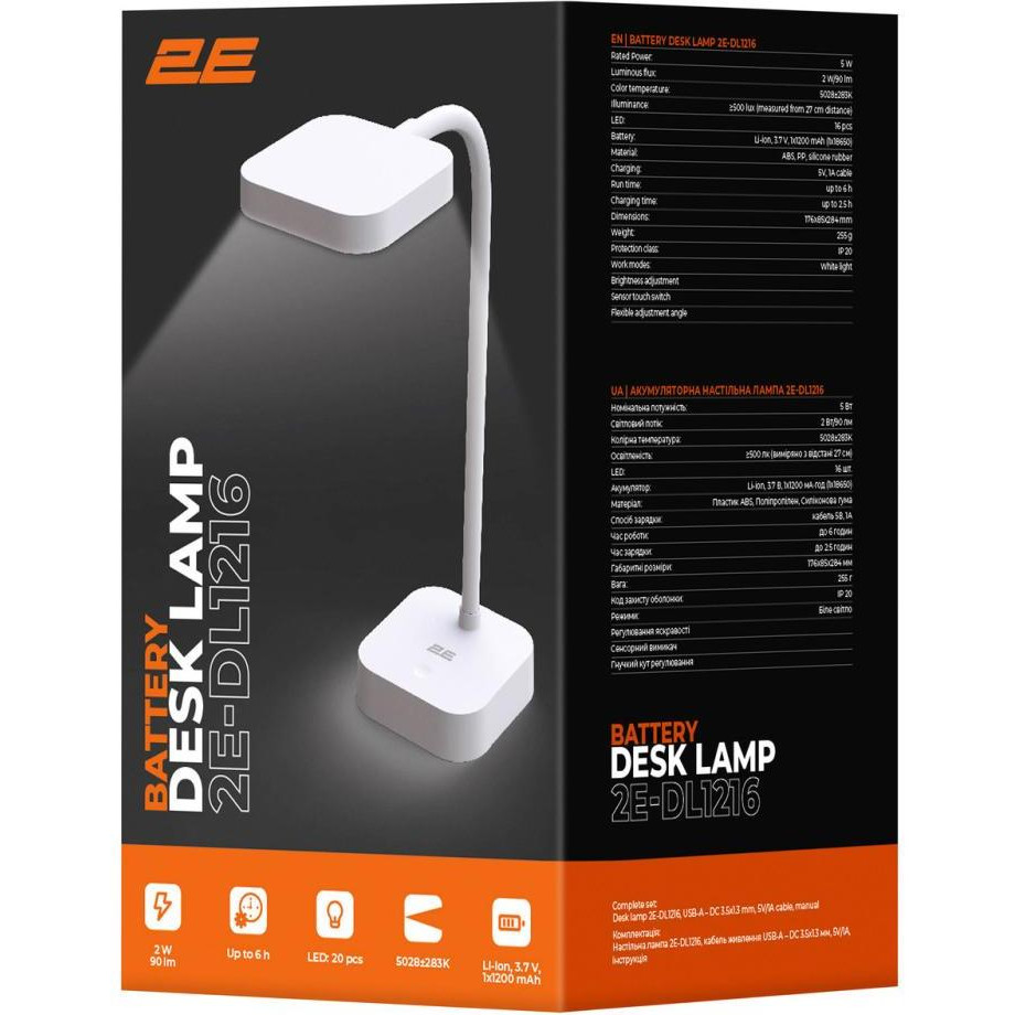 Лампа настільна з акумулятором 2E, 5Вт, 5000K, 1200мАг, USB-A, без блоку живлення, біла (2E-DL1216)