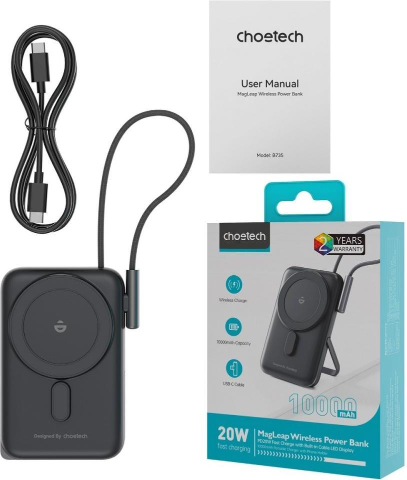 Зовнішній акумулятор Powerbank Choetech Magnetic Wireless, 10000mAh, 20W PD, USB-C In/Out, Qi 15W, build-in cabel, Black (B735-CCBK)