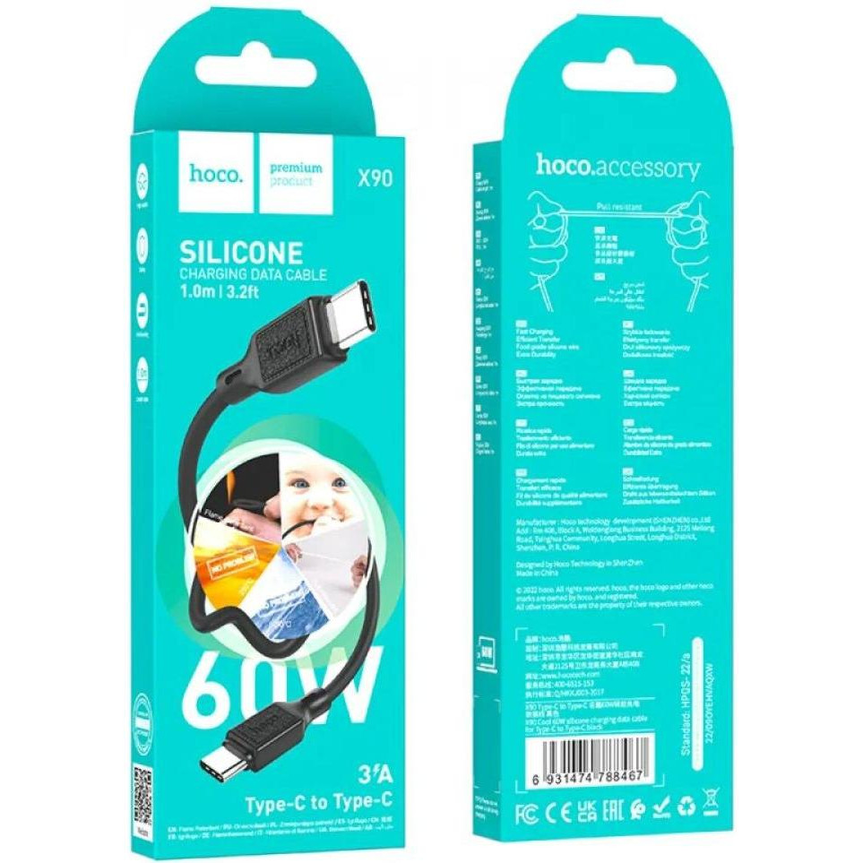 Кабель Hoco X90 Cool, USB Type-C to USB Type-C, 60W, Black (6931474788467)