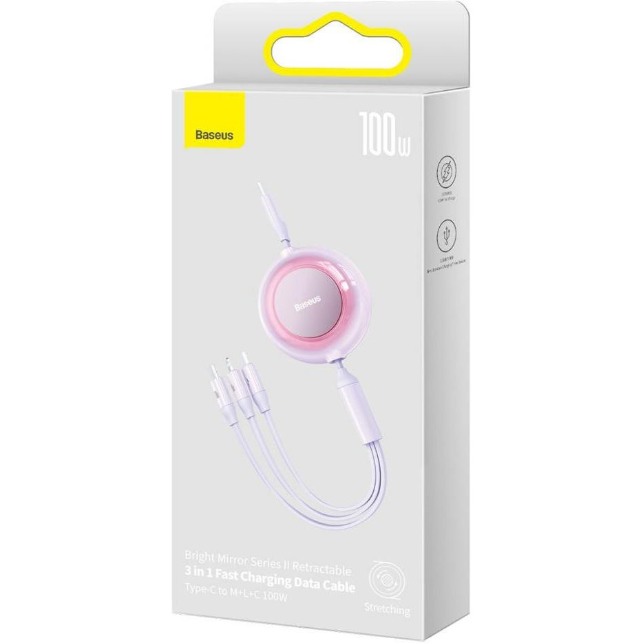 Кабель Baseus Bright Mirror 2 Series Retractable 3-in-1, USB Type-C to Micro USB/Lightning/USB Type-C, 100W, 1.1м, Purple (CAMJ010205)