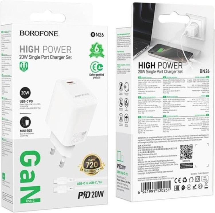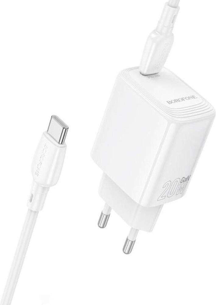 Мережевий зарядний пристрій Borofone BN26 Fuente, PD 20W, кабель USB Type-C to USB Type-C, EU, White (6941991120251)