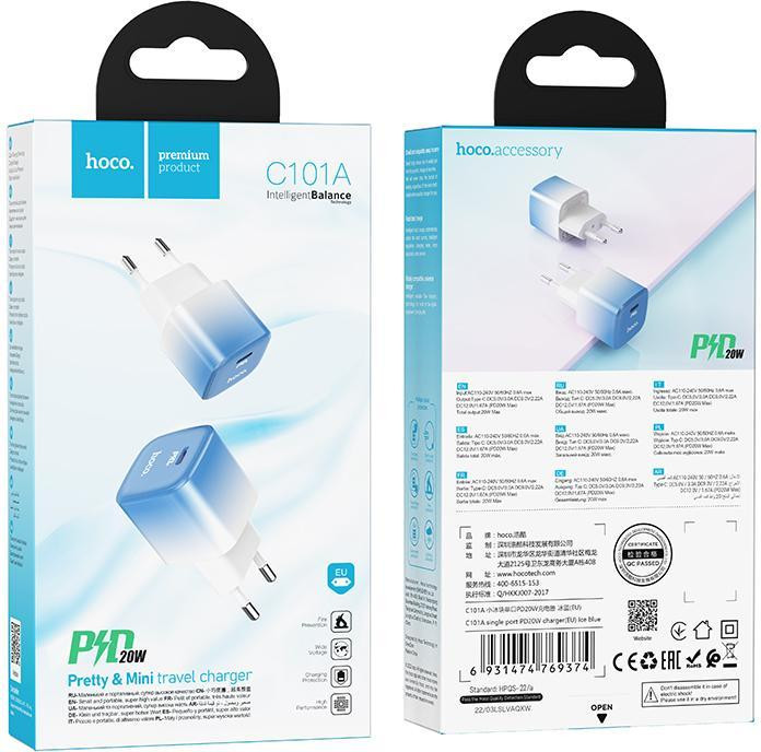 Мережевий зарядний пристрій Hoco C101A, PD 20W, Ice Blue (6931474769374)