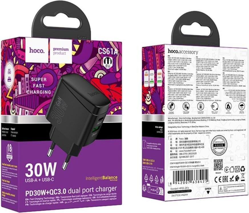 Мережевий зарядний пристрій Hoco CS61A Bright, PD 30W, QC 3.0, EU, Black (6942007638425)