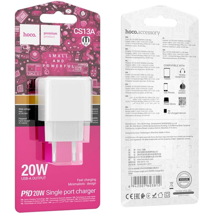 Мережевий зарядний пристрій Hoco CS13A Ocean, PD 20W, White (6942007603812)