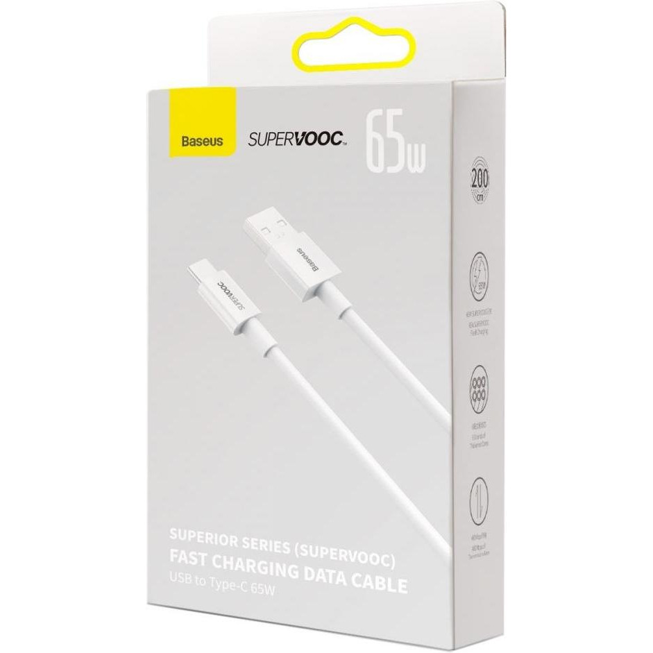 Кабель Baseus Superior Series SUPERVOOC Fast Charging Data, USB Type-A to USB Type-C, 65W, 2м, White (CAYS001002)