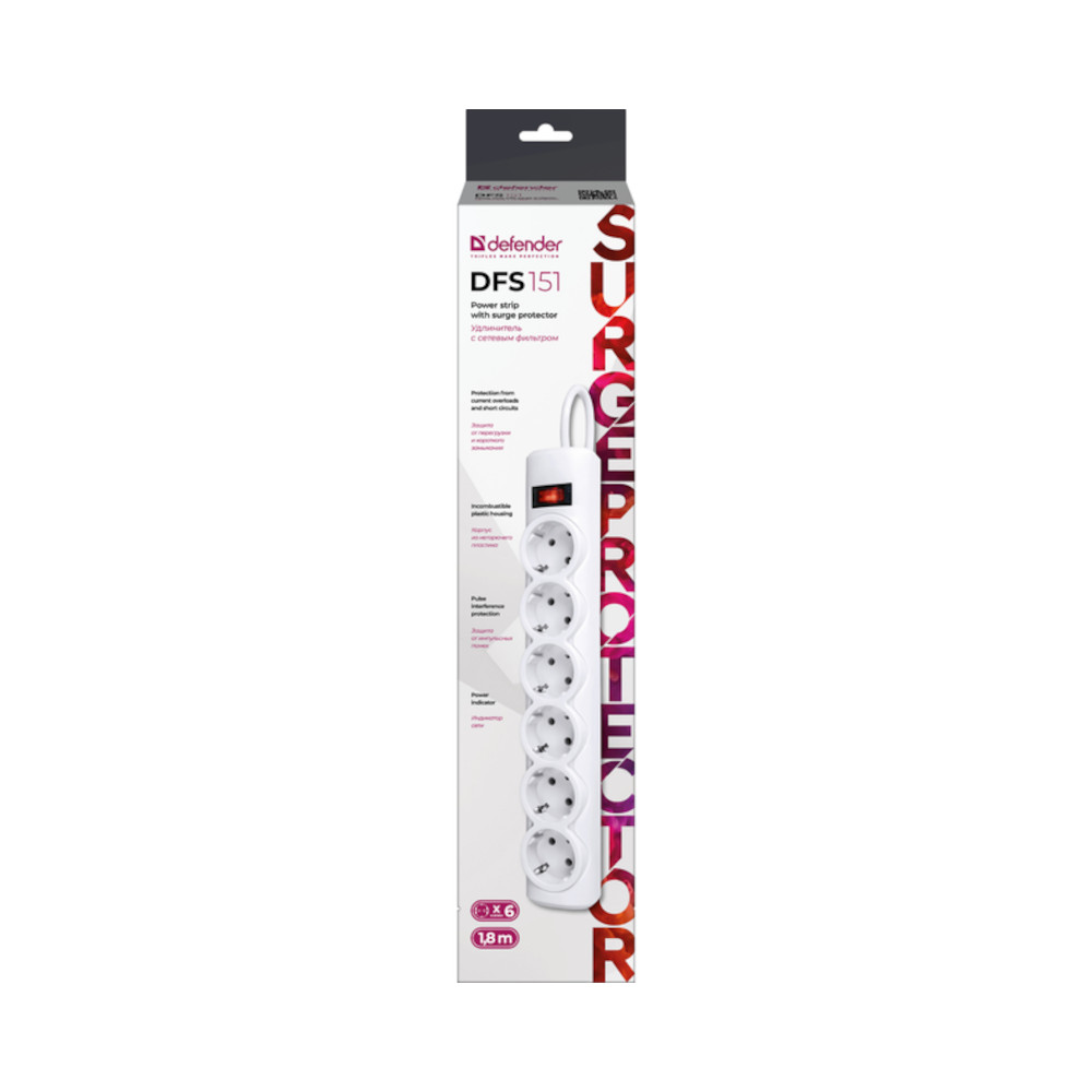 Мережевий фільтр Defender DFS151, 6 розеток, 1.8м, білий (994890)