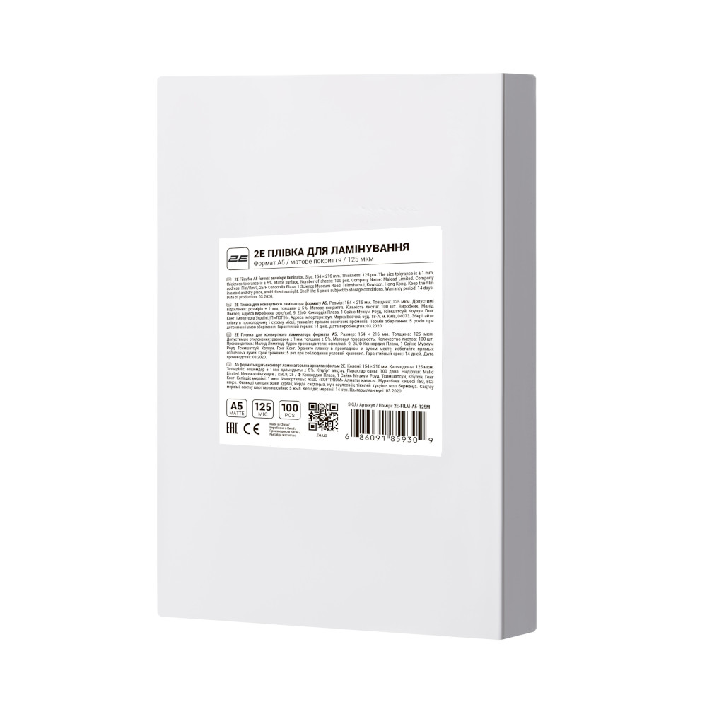 Плівка для ламінування 2E, A5, матова поверхня, 125мкм, 100шт (2E-FILM-A5-125M)